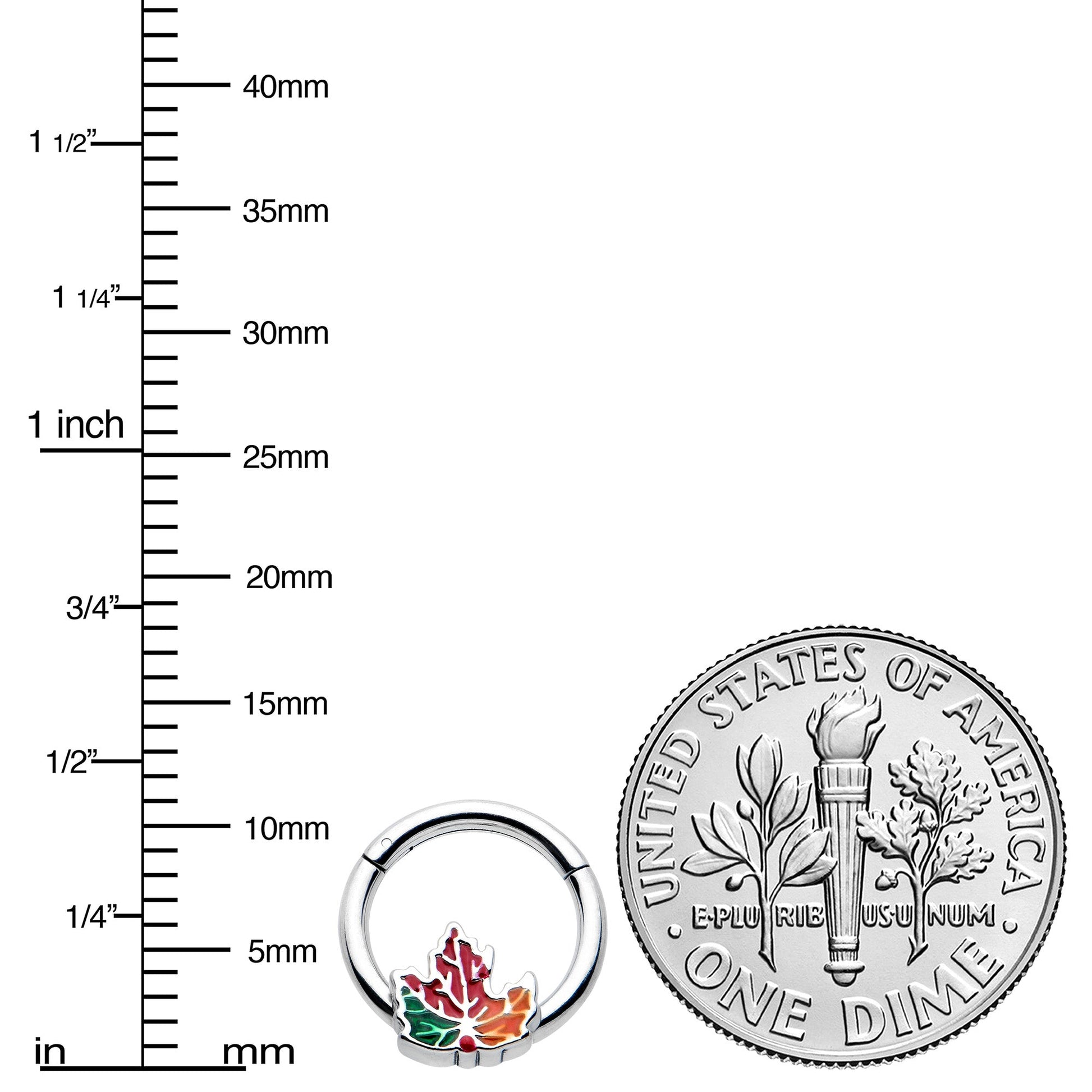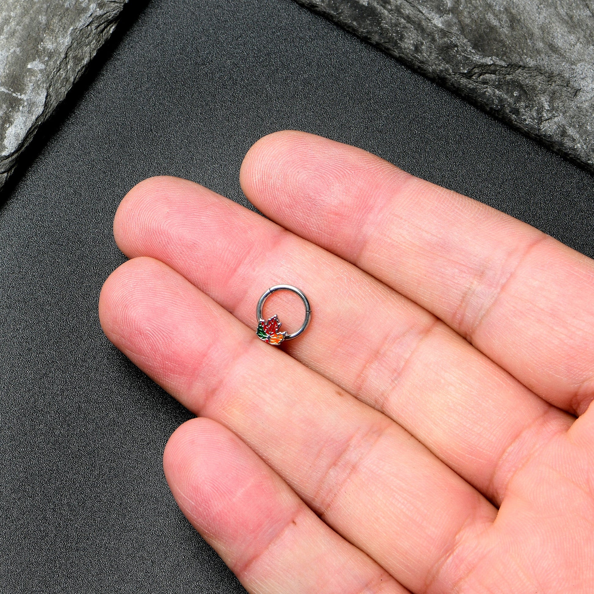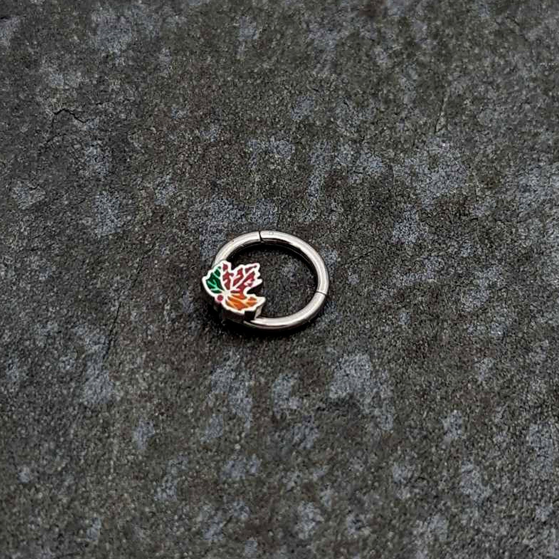 The leaves have started changing color on this 16 gauge septum ring! It's made with an 8mm durable 316L surgical grade stainless steel hinged circular ring. It features a maple leaf charm, inlaid in shades of green, red, and orange for a festive Fall feel. It also features a hinged, non-removable segment that makes insertion and removal a breeze and you can even rock it in multiple piercings including tragus, helix, and some daith piercings. Look as lovely as the Autumn leaves with this marvelous, multi-chromatic Autumn cartilage jewelry.