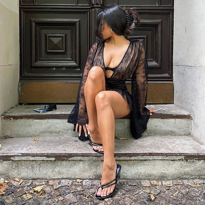 Autumn Winter Women Clothing Sexy V neck Waist Controlled Top Hip Skirt Lace Stitching Set