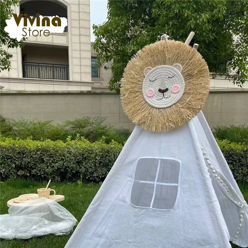 Nordic Hand Woven Lion Wall Hanging Ornaments Cartoon Animal Head Straw Weaving Children Room Wall Decor Tent Party Decoration