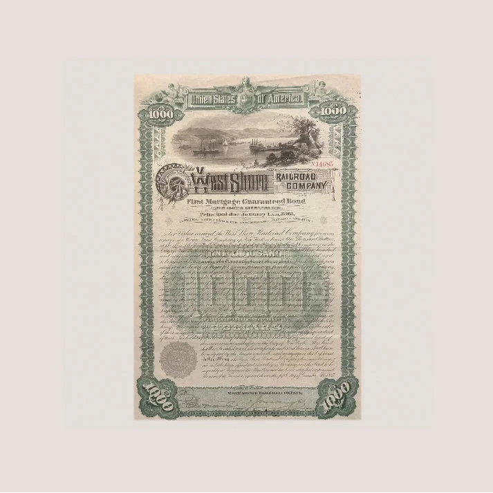 Crafted in 1885, this gold bond certificate is one of the few surviving original railroad bonds from the West Shore Railroad Company. Its rarity alone makes it an unparalleled addition to any collection, but its historical significance elevates it to a true treasure. Imagine the stories this certificate could tell – of ambitious investors, of the clamor and excitement as the railroad expanded, and of the dreams of connecting America from coast to coast.