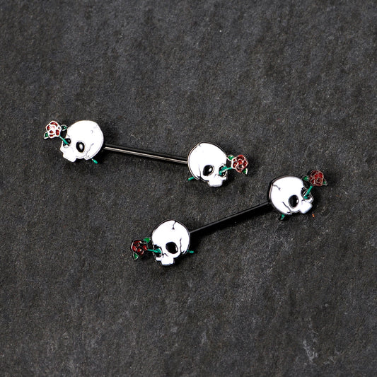 14G 9/16 Black PVD Rose Scary Skull Halloween Nipple Ring Set
