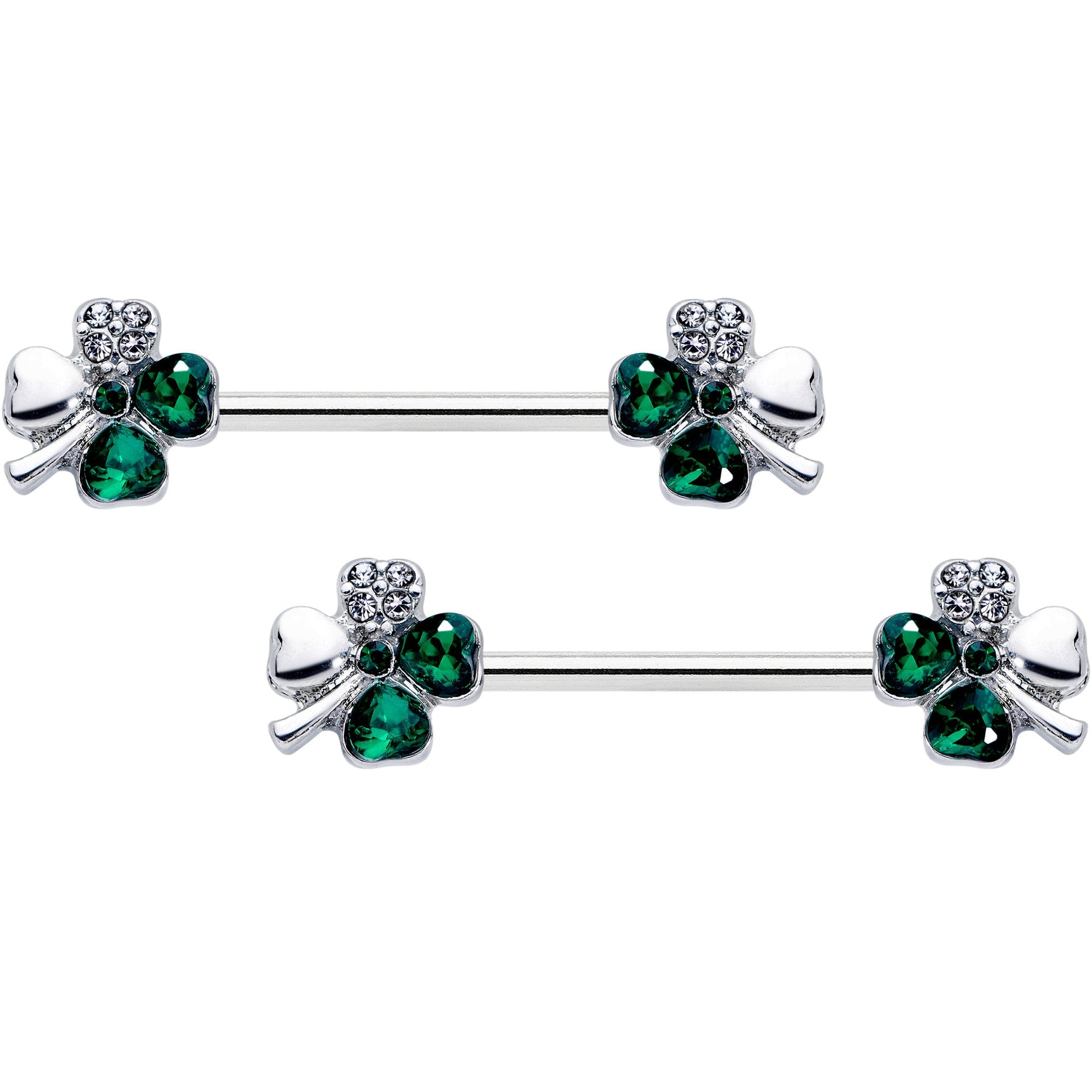 14G 9/16 Clear Green Gem Shamrock St Patricks Day Nipple Ring Set