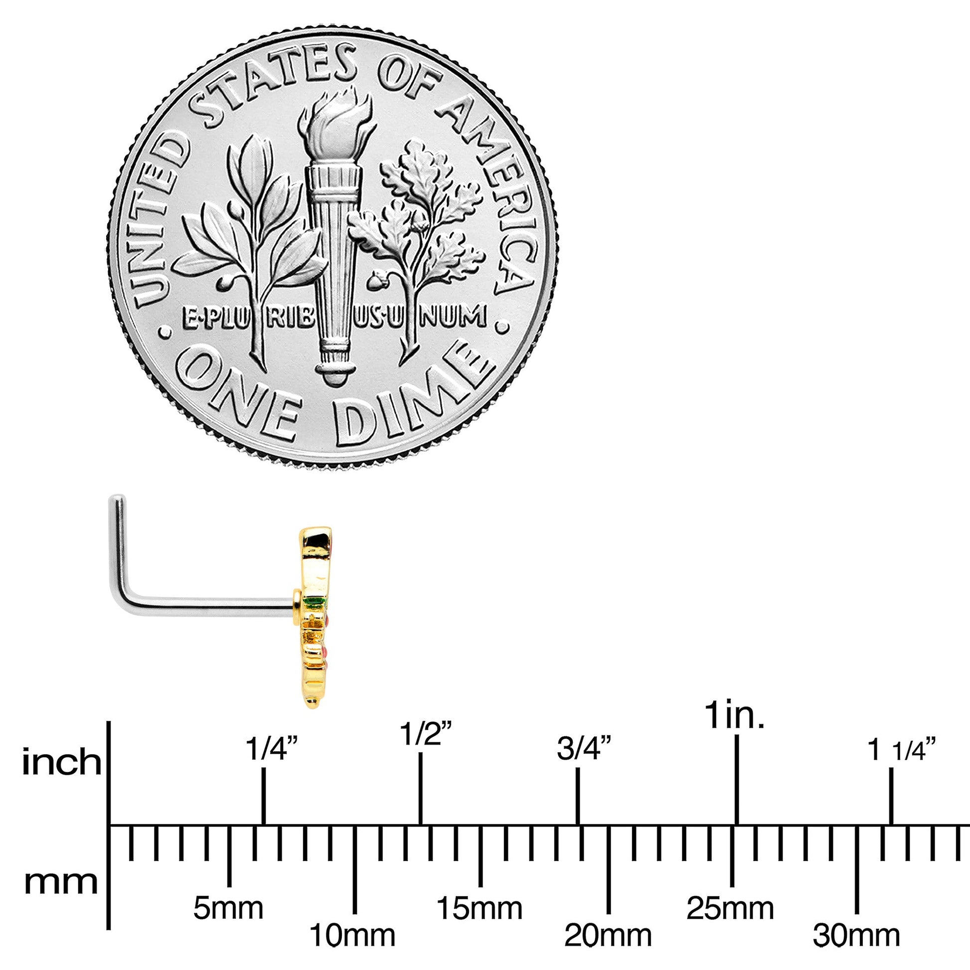 Deck your piercings with this 20 gauge nostril ring! It's made with a .27" length at the bend 316L surgical grade stainless steel L-shaped post. It features a festive Christmas tree, with green and blue inlay. It's further embellished with red gem orbs and a red gem inlaid star on top. You'll be feeling fabulous and festive when you're rocking this Christmas nose piercing jewelry around!