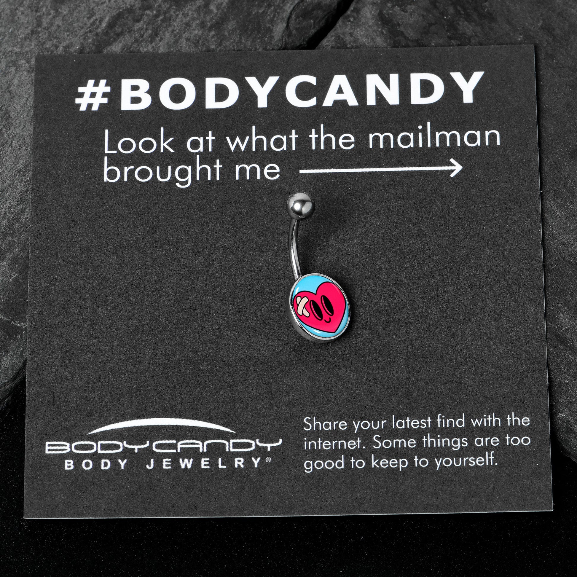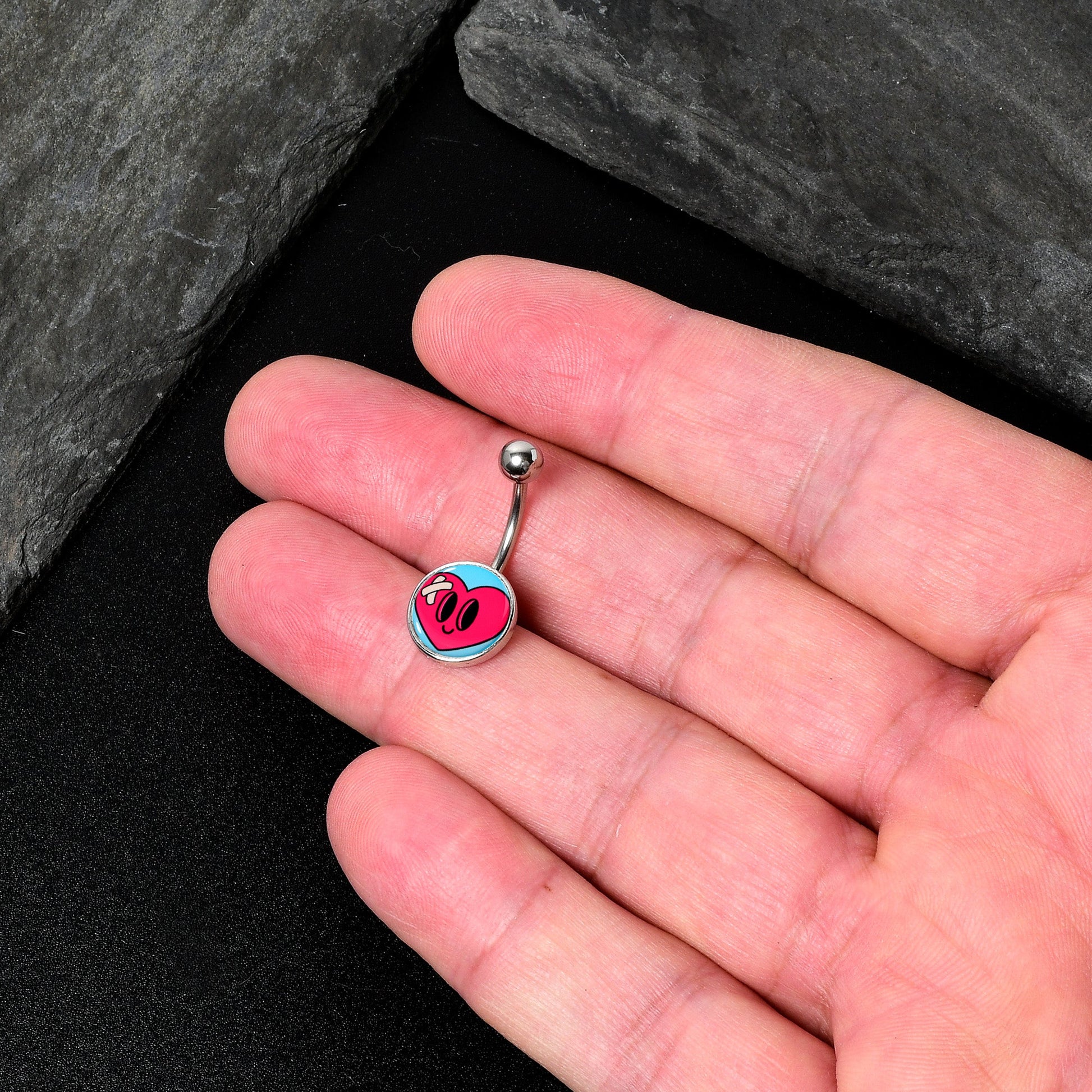 If your heart has been hurt, you're sure to fall in love with this 14 gauge navel ring! It's made with a 7/16" durable 316L surgical grade stainless steel curved barbell with a 5mm top ball end. The bottom end features a blue, disc shaped charm that features an anthropomorphic heart. The heart has a pair of crossed bandages on it and a bravely smiling expression. Let love heal your wounds with this adorably courageous heart belly piercing ring.