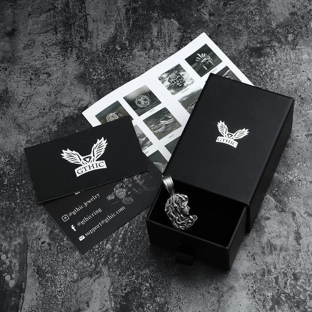 Medusa, in Greek mythology, the most famous of the monster figures known as Gorgons. She was usually represented as a winged female creature having a head of hair consisting of snakes; unlike the Gorgons, she was sometimes represented as very beautiful. The material of this pendant is pure tin, and the material of the chain is stainless steel. Through careful engraving, the finished product displayed is very realistic. Do you like it?