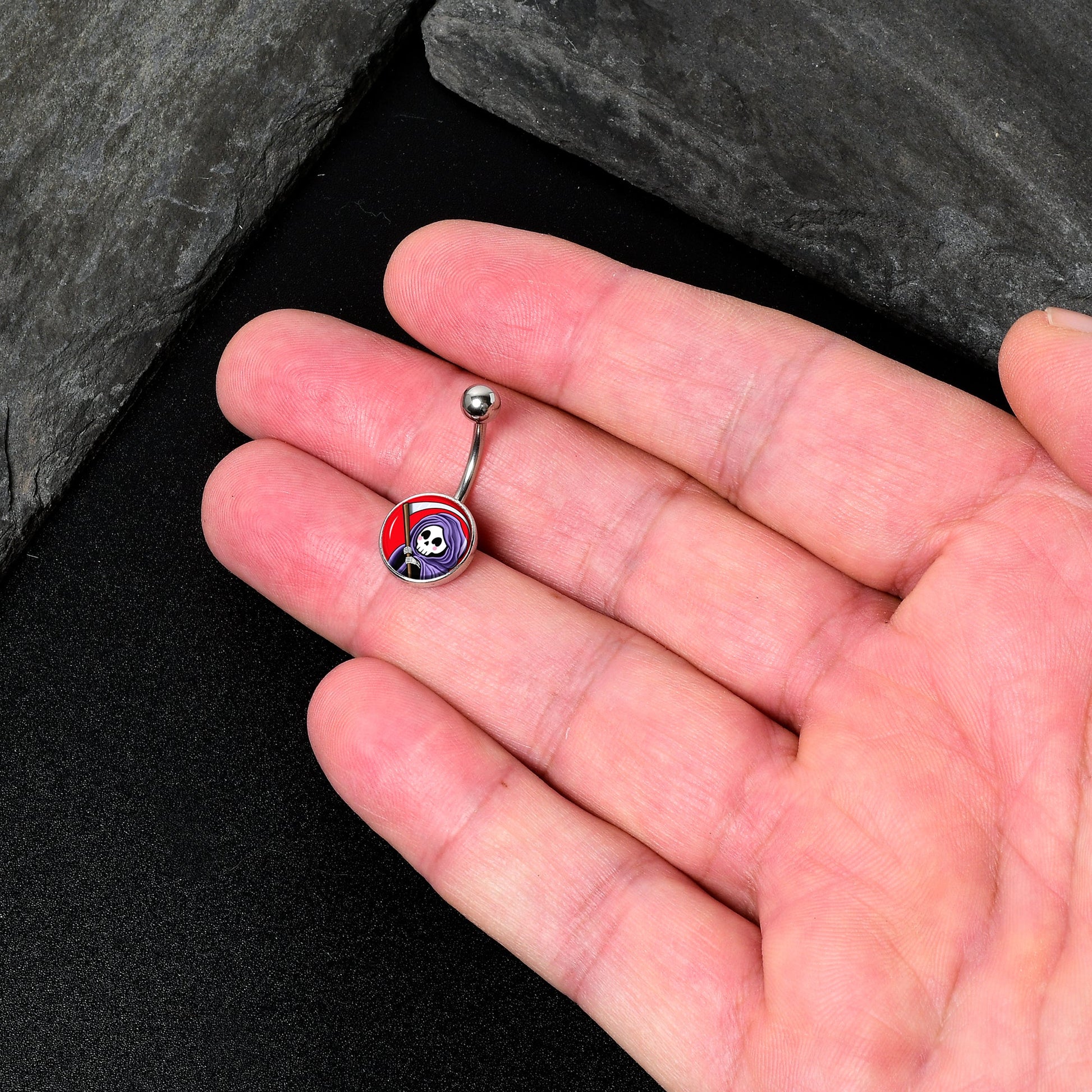 Death to boring belly jewelry - when you're rocking this 14 gauge navel ring! It's made with a 7/16" durable 316L surgical grade stainless steel curved barbell with a 5mm top ball end. The bottom end features a disc shaped grim reaper charm with a vivid red background. The fantasy-styled grim reaper has a purple cloak and curving scythe for a traditional twist. If you're dying for a new look, this colorful belly piercing ring is exactly what you're after!