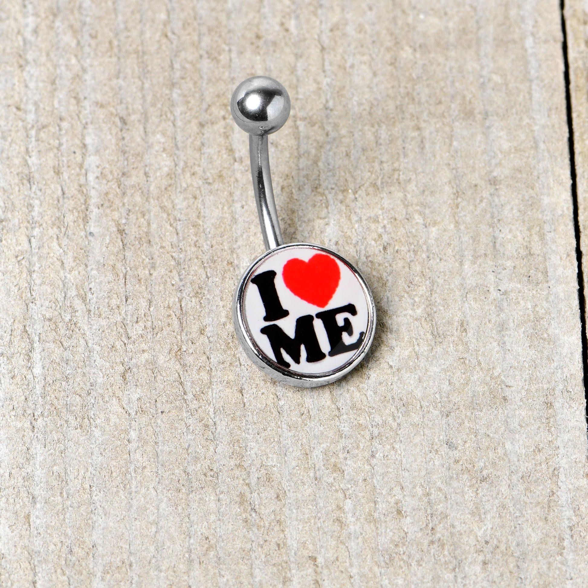 Tell the world who your number one love is with this 14 gauge navel ring! It's made with a 7/16" durable 316L surgical grade stainless steel curved barbell with a 5mm top ball end. The bottom end features a white disc charm that boldly proclaims "I Love Me", with a red heart adding color and contrast that really catches the eye. If you're all about self-love, show it off with this whimsical belly piercing ring!