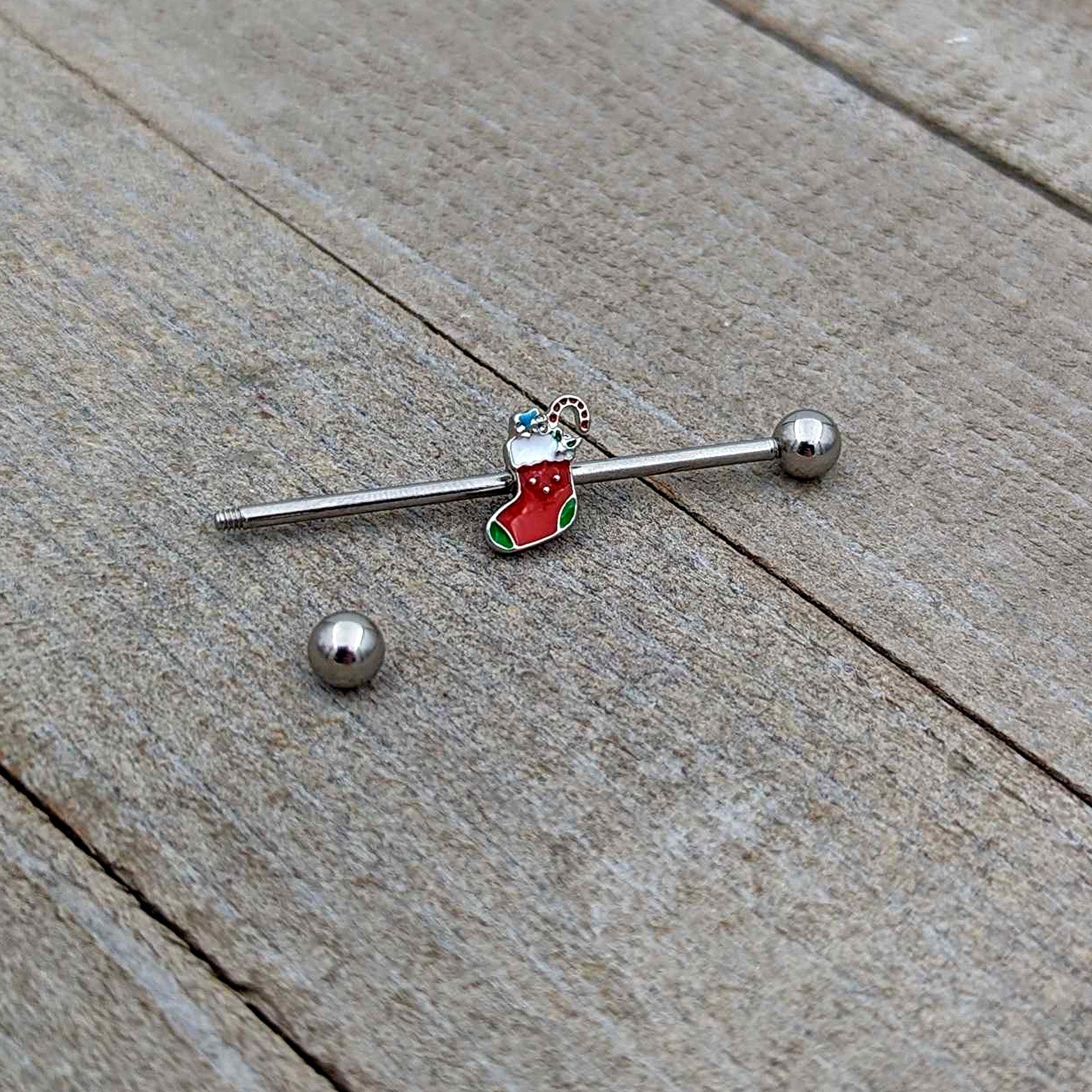This stocking looks as happy as you'll be when you're rocking this 14 gauge helix barbell! It's made with a 1 1/2" durable 316L surgical grade stainless steel straight barbell with 5mm ball ends. It features a Christmas stocking charm, inlaid in red and green. The stocking features a candy cane and gift embellishments at the top and a tiny little face below the cuff. You can even slide it up and down the length of the barbell for the perfect look. This stocking is sure to make you smile back when you're rocking this festive, holiday barbell earring!