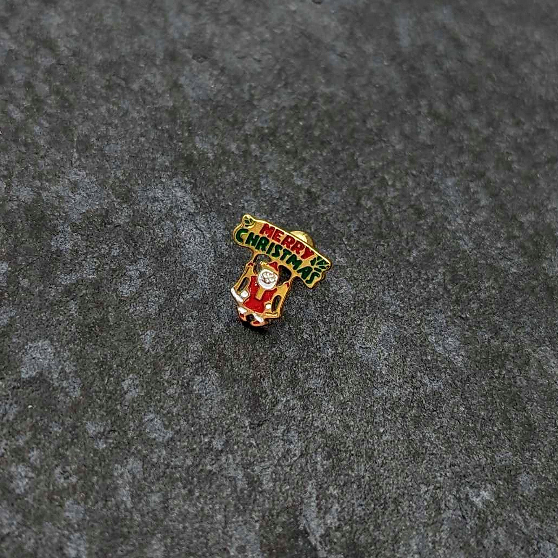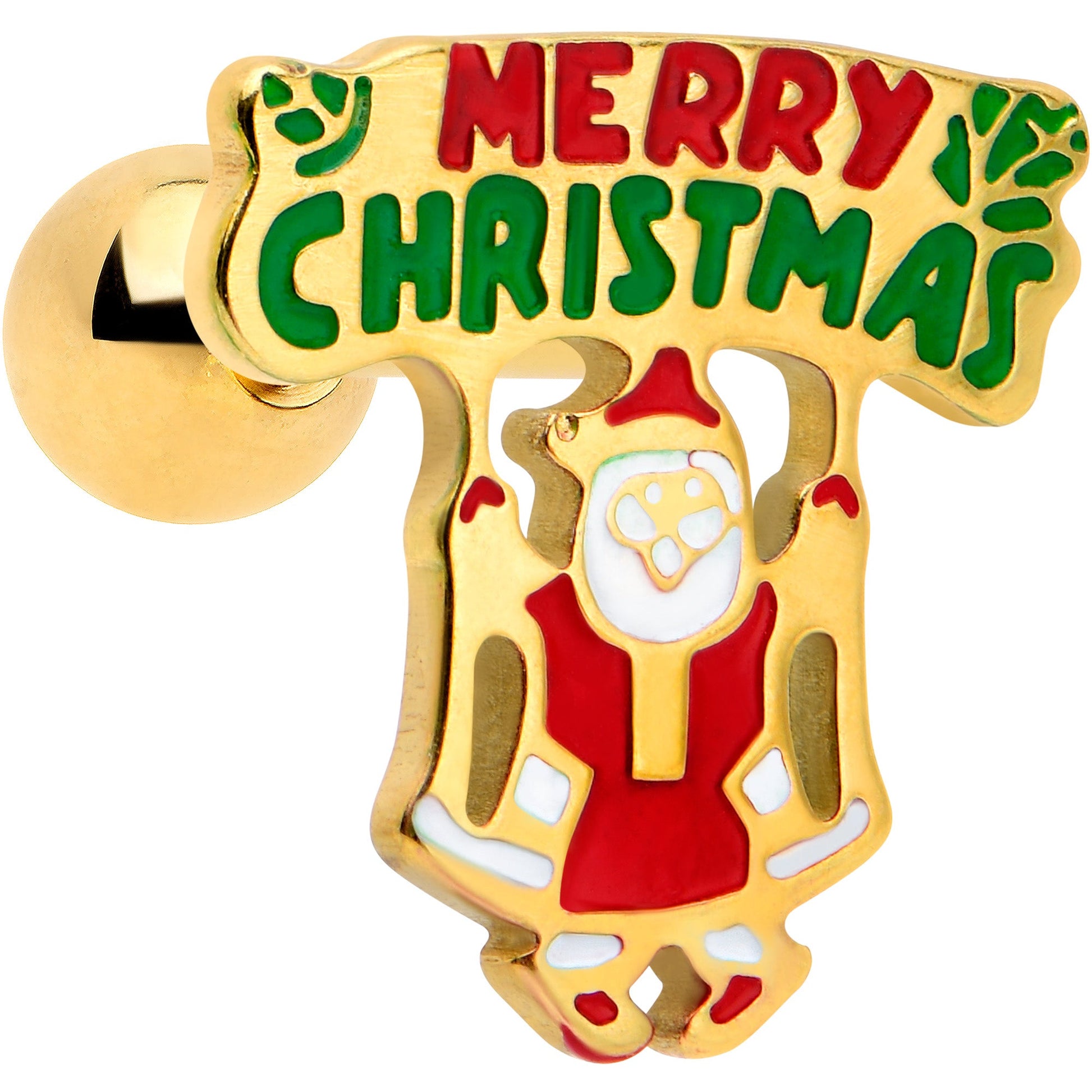 Keep the message simple with this 16 gauge tragus stud! It's made with a 6mm gold tone PVD over 316L surgical grade stainless steel straight barbell with a 4mm ball end. It features a Merry Christmas charm, with the words inlaid in festive red and green. The charm is rectangular for simple style and is being held up by a matching Santa Claus. You can even rock it in multiple piercings including tragus, helix, and some conch piercings. Get your message across with this word-perfect holiday cartilage piercing ring!Specifications