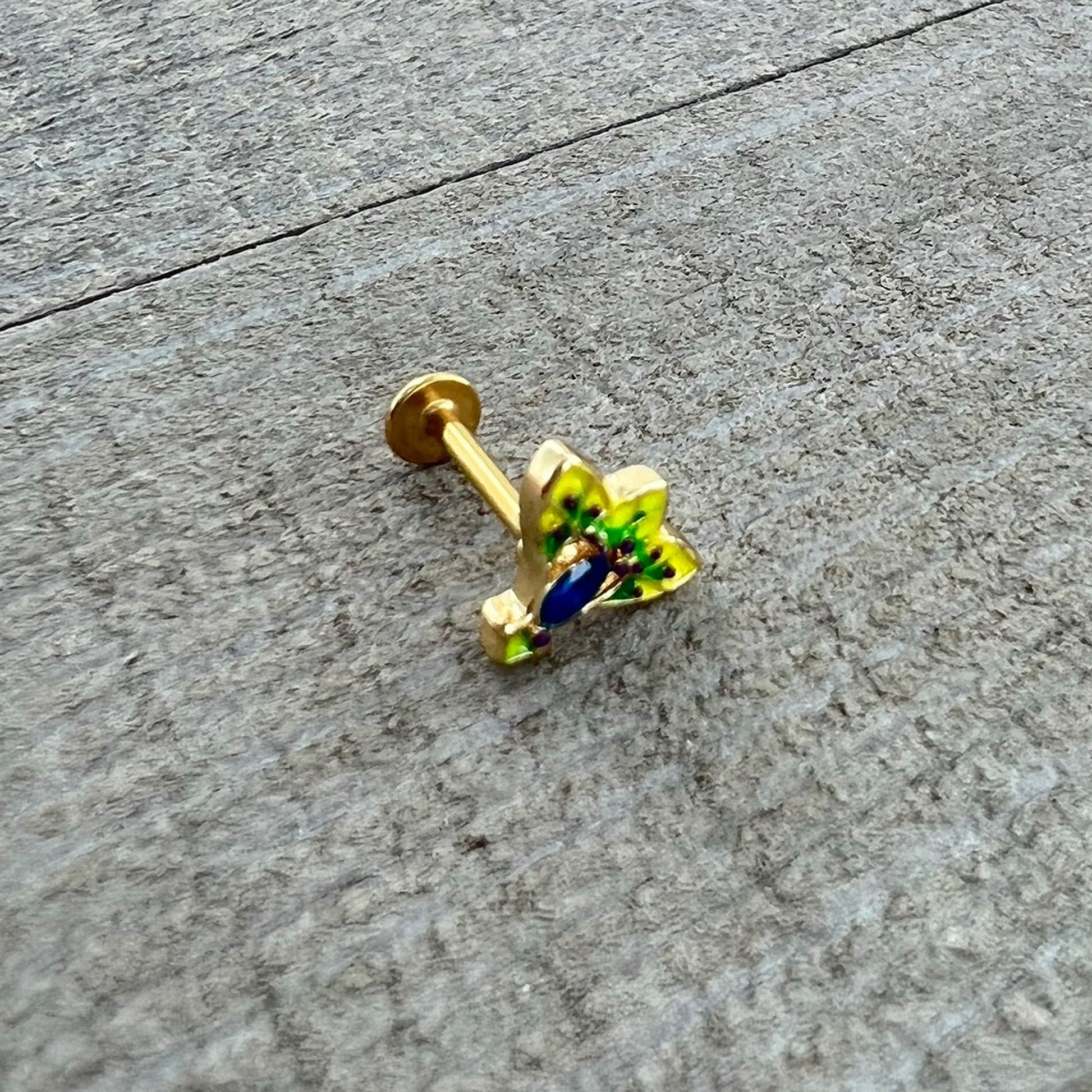 Take your look to the tropics with this 16 gauge lip ring! It's made with an 8mm gold tone PVD over 316L surgical grade stainless steel straight post with a flat disc end. It features a tropical charm of green and yellow leaves. It's set with a blue gem at the top, flanked by a pair of smoky yellow gems, and set with purple embellishments for a truly luxurious appearance. You can even rock it in multiple piercings including lip, monroe, tragus, helix, and some conch piercings. You're sure to be a fan of this tropical fan cartilage jewelry!Specifications