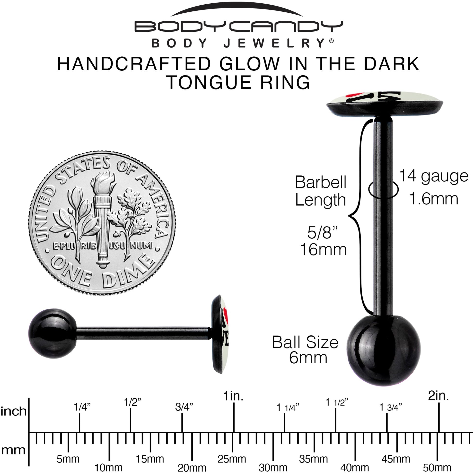 When you really love something, share it with the world by rocking this 14 gauge stainless steel tongue jewelry. It's made with a 5/8 inch black anodized titanium over 316L surgical grade stainless steel straight barbell with a 6mm bottom ball end. The top end features a white disc logo charm that says I heart Weed in black with the heart in red for maximum contrast. And when the lights go down, it even glows in the dark. If you prefer pot then brag about getting baked with this stainless steel tongue piercing jewelry. Unique artist-drawn logo inlay design surgical steel tongue ring.
