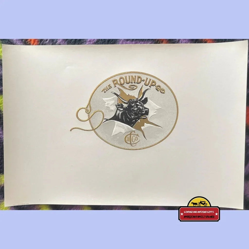 Step into the world of vintage elegance with the extraordinary Antique Vintage "The Round-Up" Embossed Cigar Label! This stunning piece of history from the early 20th century (1900s - 1920s) showcases a magnificent bull or steer, capturing the spirit of the American West. Measuring an impressive 9 x 6 1/2 inches, this embossed cigar label is a true testament to the artistry and craftsmanship of a bygone era.