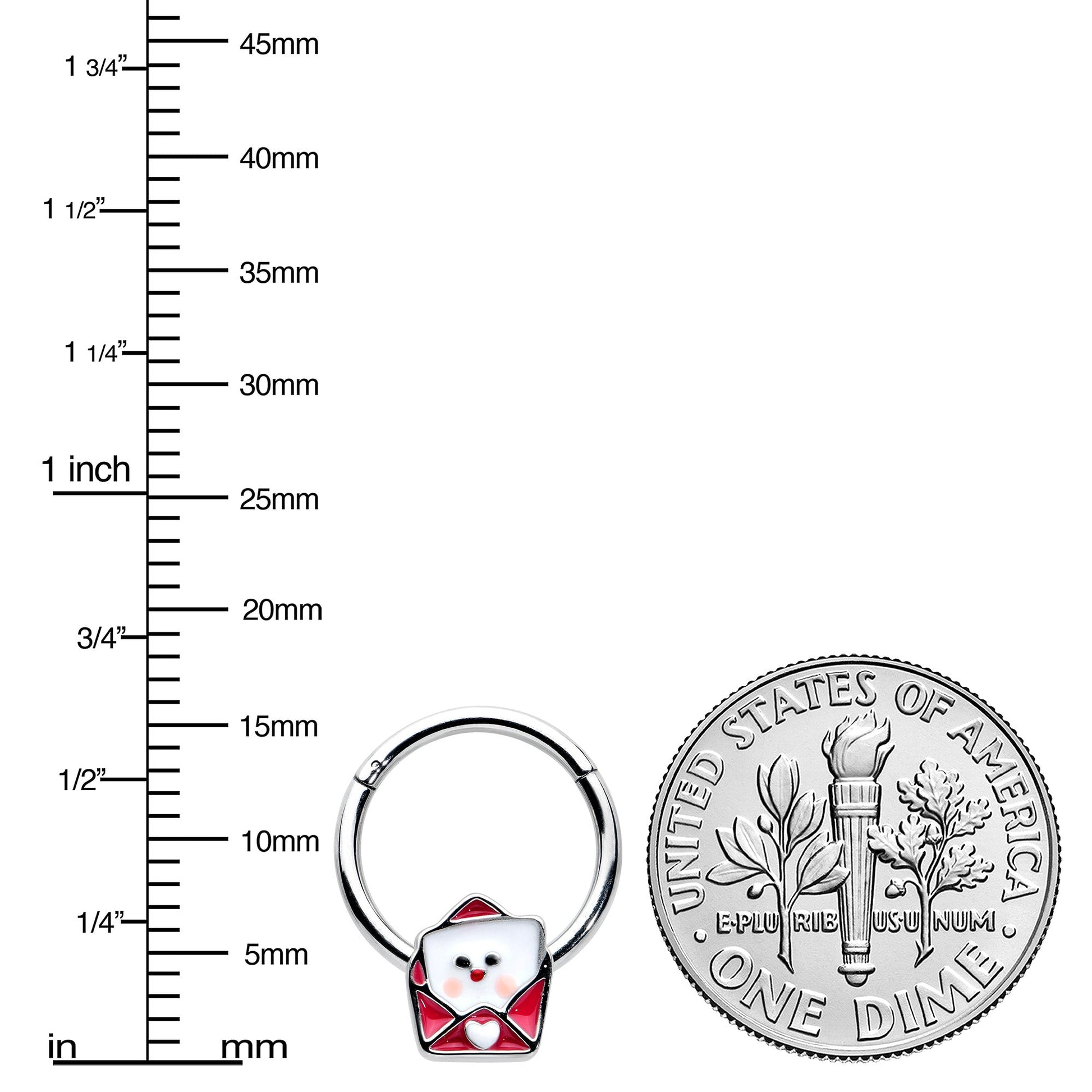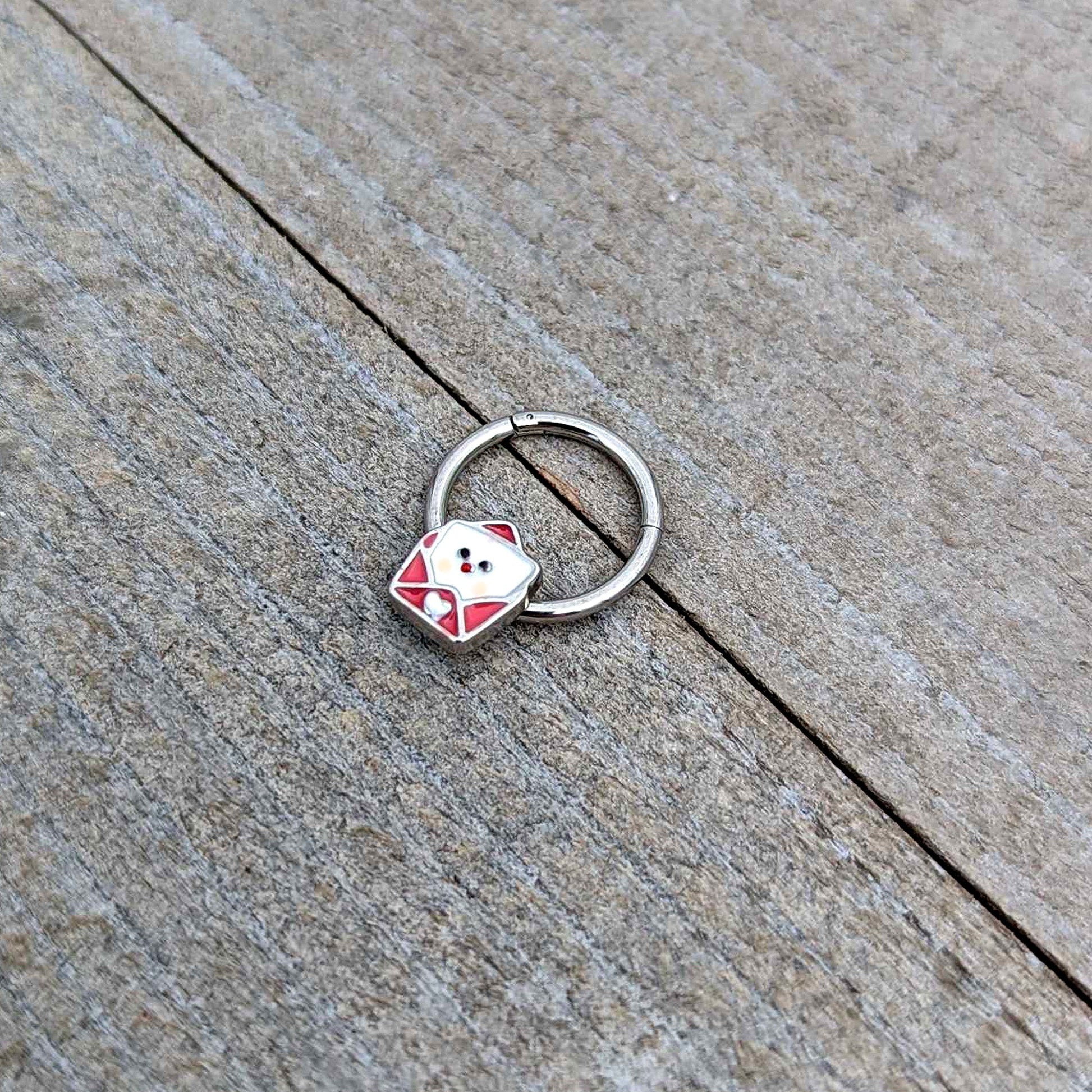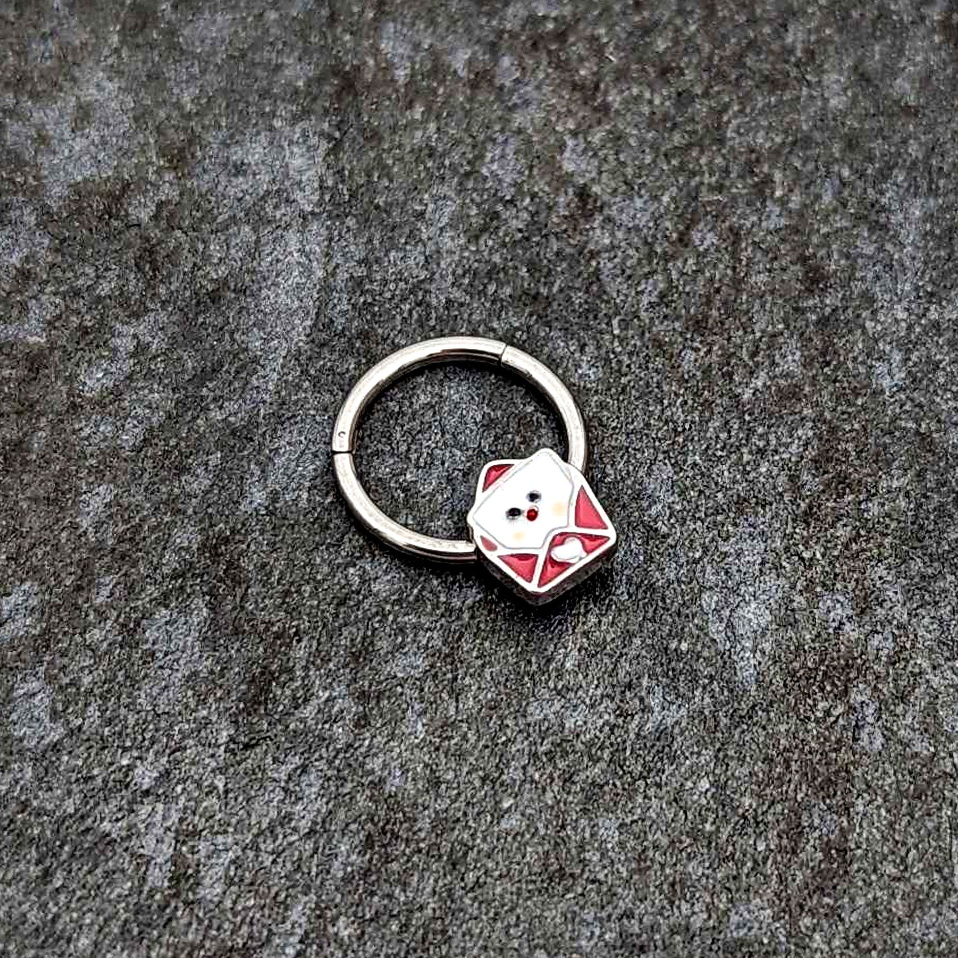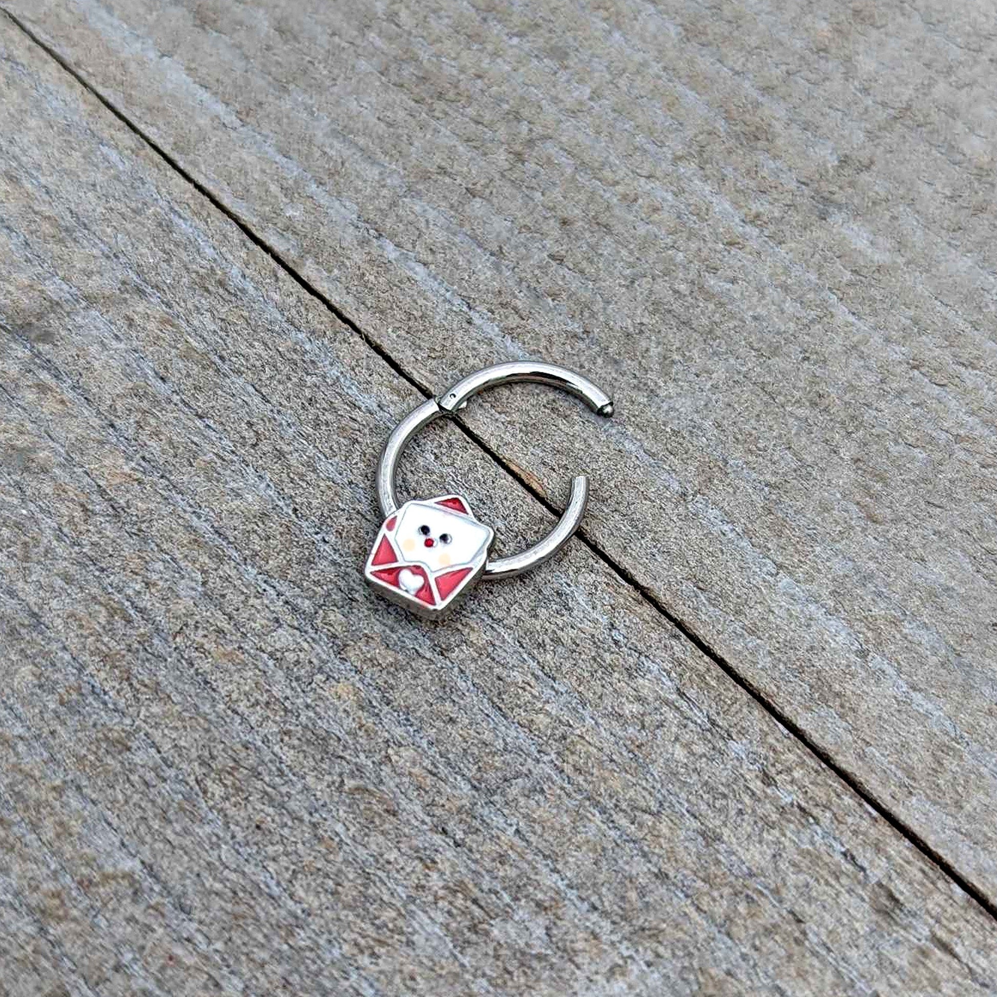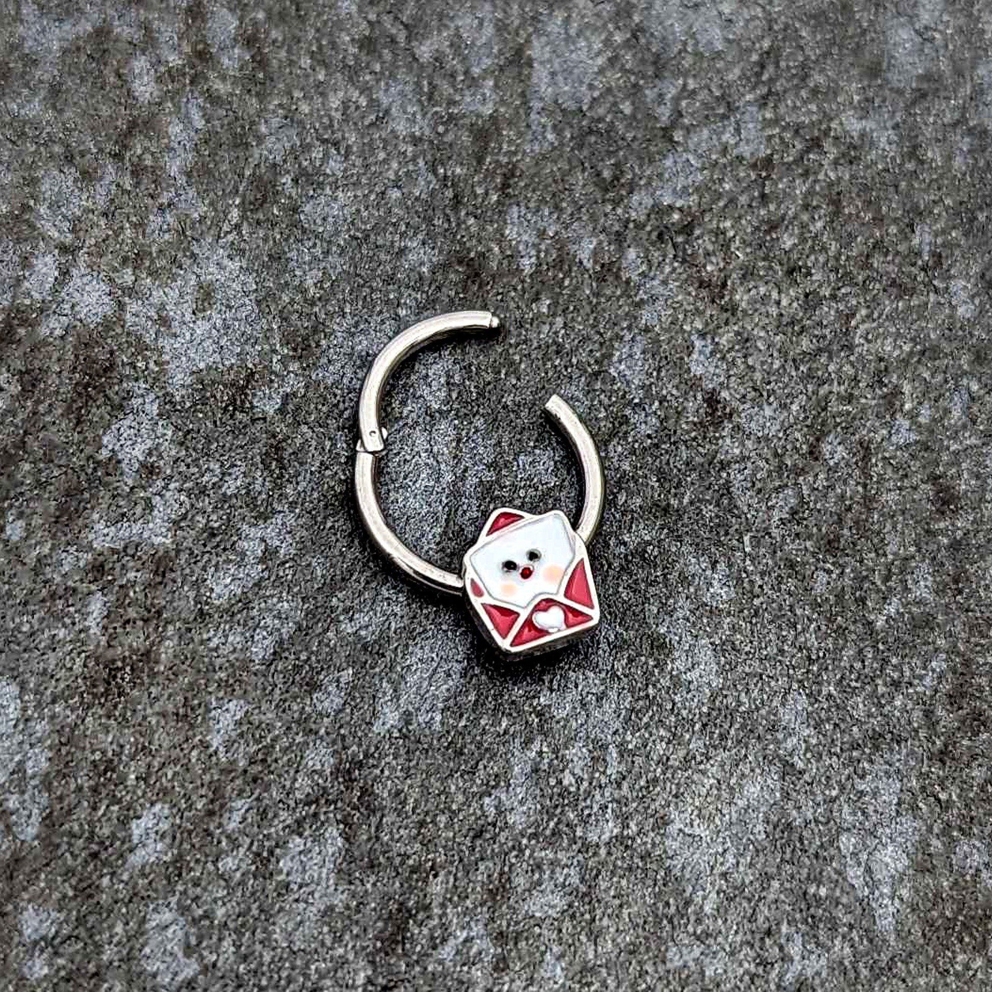 Tell your piercings how you really feel with this 16 gauge septum ring! It's made with a 10mm durable 316L surgical grade stainless steel hinged circular ring. It features a valentine charm, with a red inlaid envelope and a white love letter peeking out. The envelope is further embellished with a small white heart. It also features a non-removable, hinged segment and you can rock this in multiple piercings including tragus, helix, and some daith piercings. Express yourself with this endearing Valentine's Day cartilage piercing ring!
