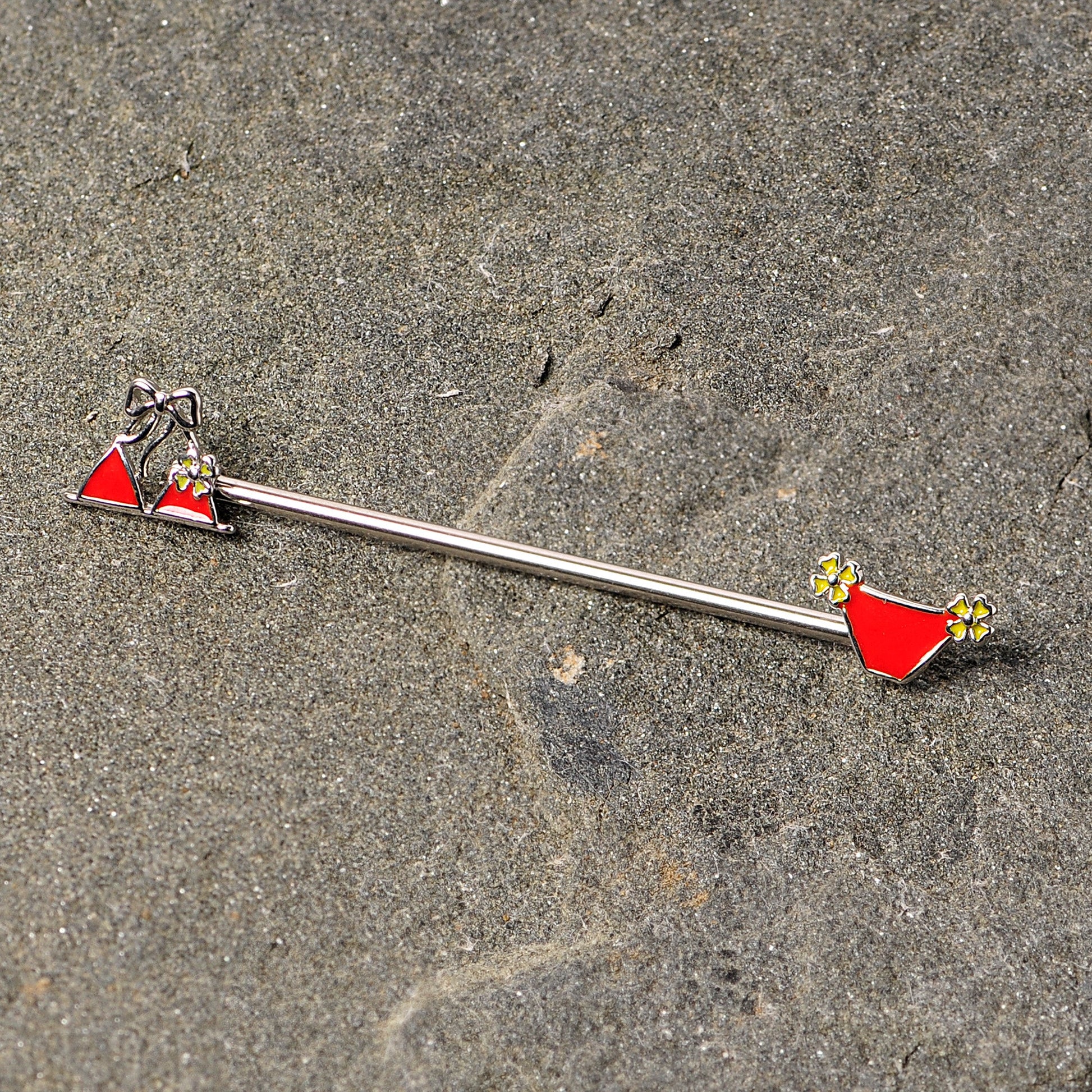 This little bathing suit looks fabulous on everyone and you don't need warm weather to wear it! This 14 gauge helix barbell is made with a 1 1/2" durable 316L surgical grade stainless steel straight barbell. One end features a red swimsuit top charm with a yellow flower embellishment and bow-tie detailing. The other end features a matching red bikini bottom charm featuring twin flower embellishments. Whether you're poolside or fireside, this bikini will ensure that your industrial piercing is always dressed appropriately!