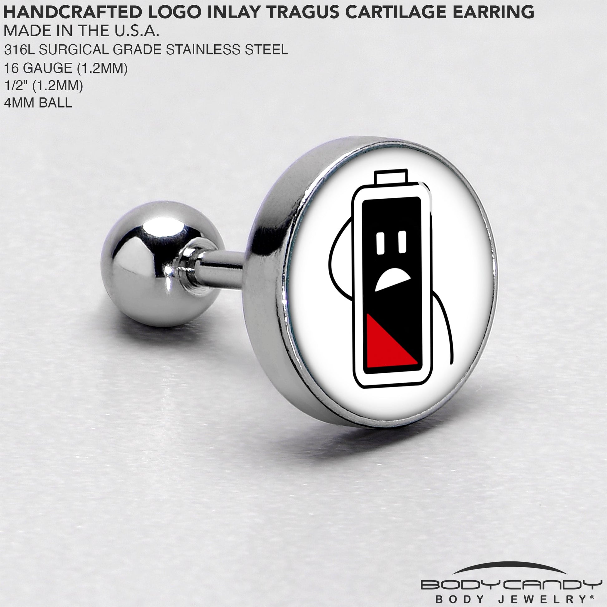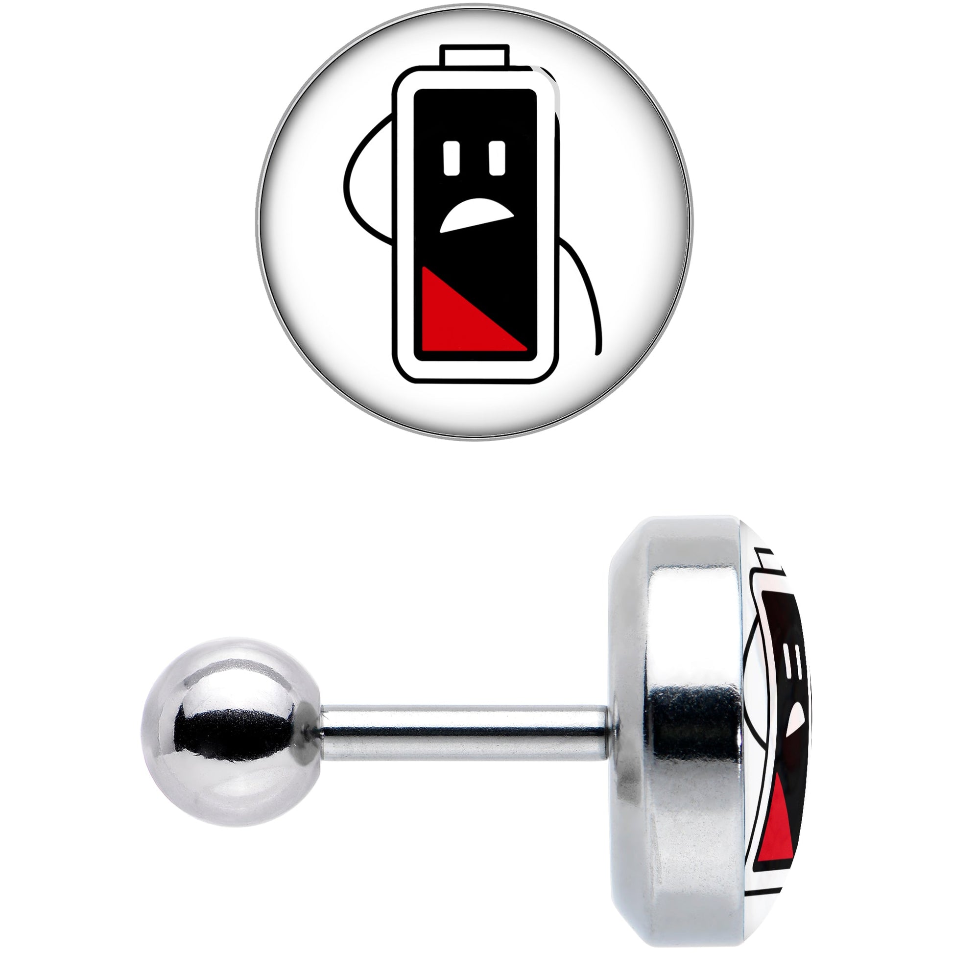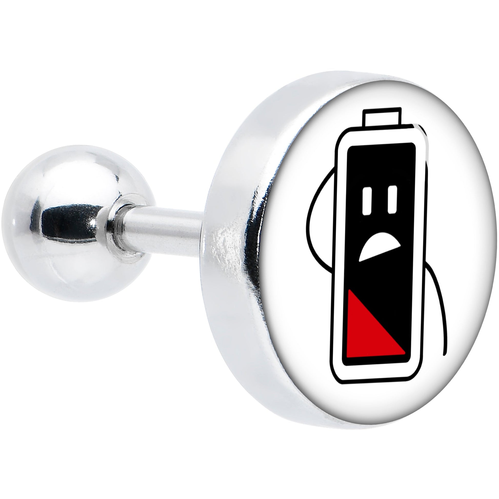 We can all relate to feeling drained like the battery on this 16 gauge tragus stud. It is made with a 6mm durable 316L surgical grade stainless steel straight barbell with a 4mm ball end. It features a white disc with a battery icon on it. The battery is down to its last bit of charge and looks appropriately distressed, with a comic expression and you can rock it in multiple piercings including tragus, helix, and some conch piercings. Let the world know you are in need of a charge with this drained battery cartilage piercing ring.