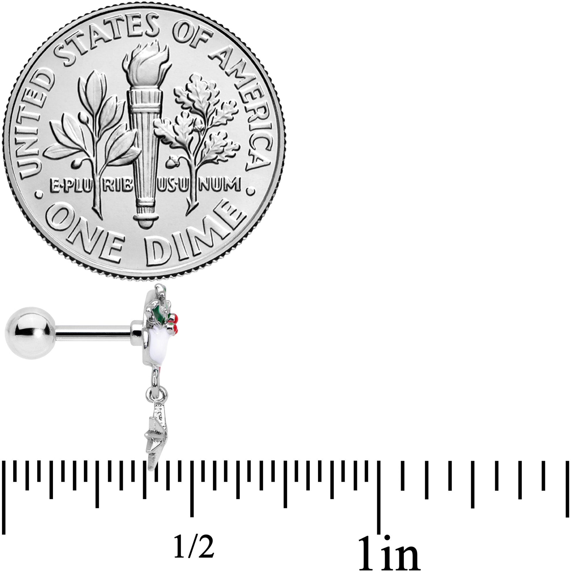 Put some holly in the holiday spirit with this 16 gauge cartilage stud! It's made with a 6mm durable 316L surgical grade stainless steel straight barbell with a 4mm ball end. It features a charm of a Santa hat, in traditional red and trimmed with a white band. The hat also features a large sprig of holly, inlaid with green leaves and red berries. Dangling from the hat's pointed end is a tiny silver-tone star, set at the center with a clear gem. And you can rock this hat in multiple piercings including tragus, helix, and some conch piercings. This holiday season, get jolly with some holly and let Santa's hat spruce up your cartilage piercing!