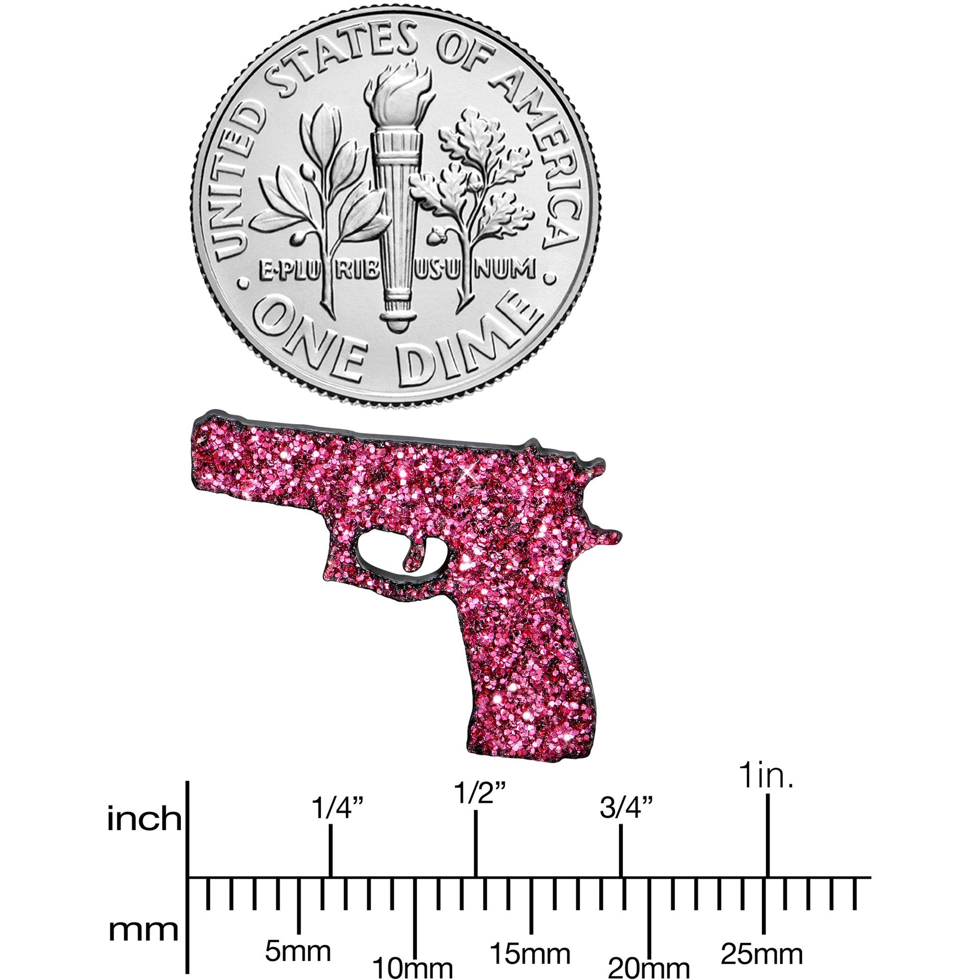 These 20 gauge fashion earrings are made with 316L surgical grade stainless steel posts and feature 3/4" wide acrylic gun charms paved in pink glitter. These earrings for women also feature butterfly-style friction backs for a secure fit. Sold as a set of two.Specifications