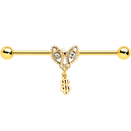 14G Clear Gem Gold Hue Seeing Money Dangle Industrial Barbell 38mm