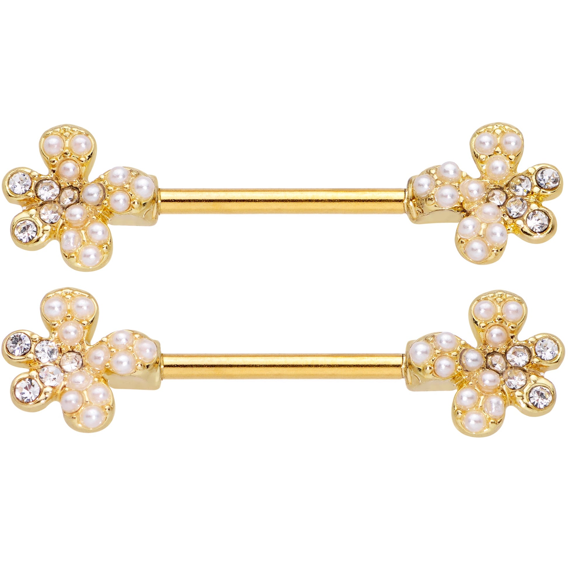 The splatter on this 14 gauge nipple jewelry is one you won't be in a hurry to mop up! It's made with 14mm gold tone PVD over 316L surgical grade stainless steel straight barbells. Each of the ends features a whimsical splat charm, set with white orbs on one side and with clear gems on the other. With their charming shape, luxe detailing, and clever design, these are some splats that are sure to suit any style! Sold as a set of two.