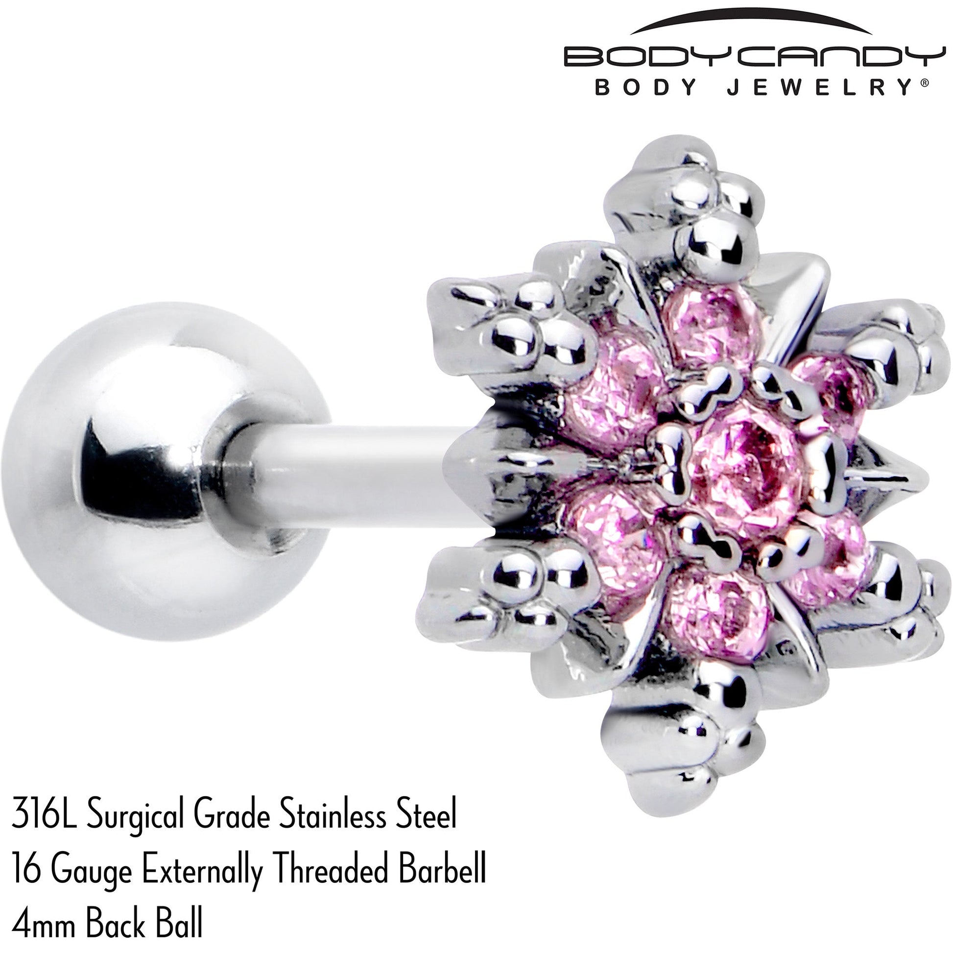 This winter, get fashionable and funky with the glamorous snowflakes on this 16 gauge tragus stud. It's made with a 6mm durable 316L surgical grade stainless steel straight barbell with a 4mm ball end. It features a heavily ornamented snowflake charm, with pink cubic zirconia gem embellishments and textured detailing. You can even rock it in multiple piercings including tragus, helix and some conch piercings. You'll have glamour to spare all winter long with this stylish snowflake cartilage piercing jewelry.