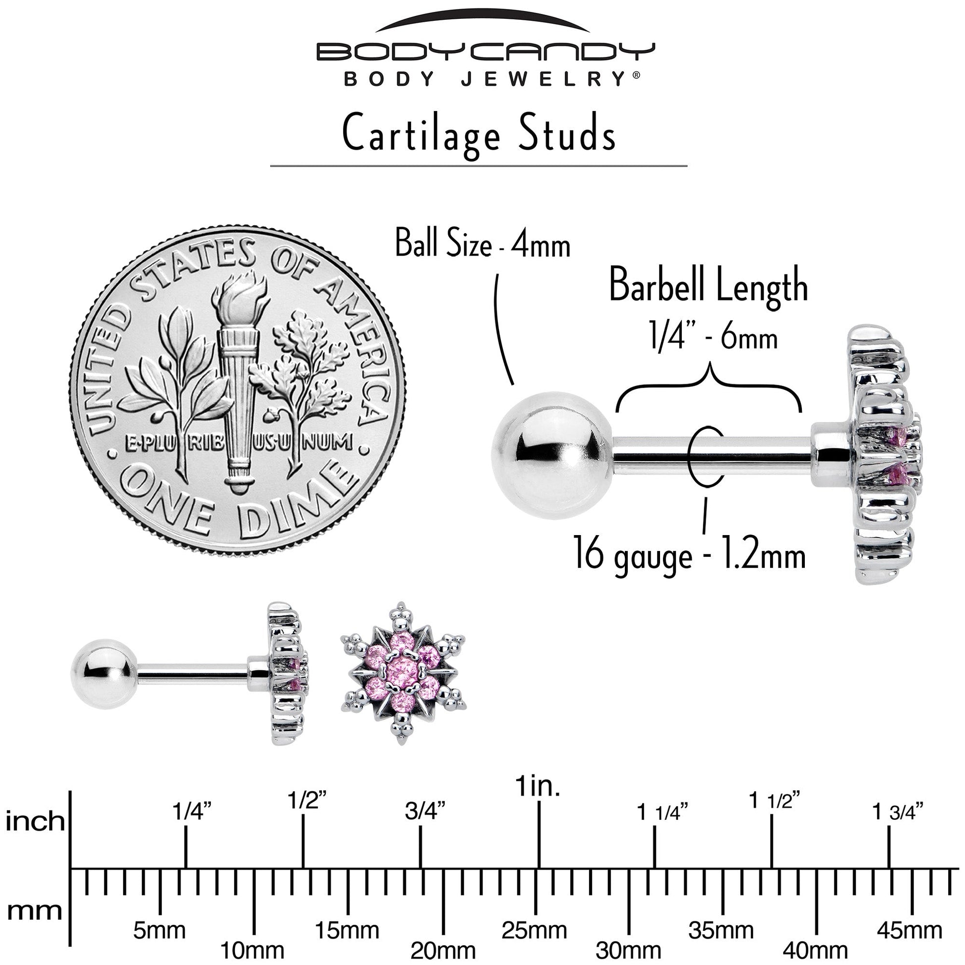 16G 1/4 Pink CZ Gem Glam Snowflake Cartilage Tragus Earring