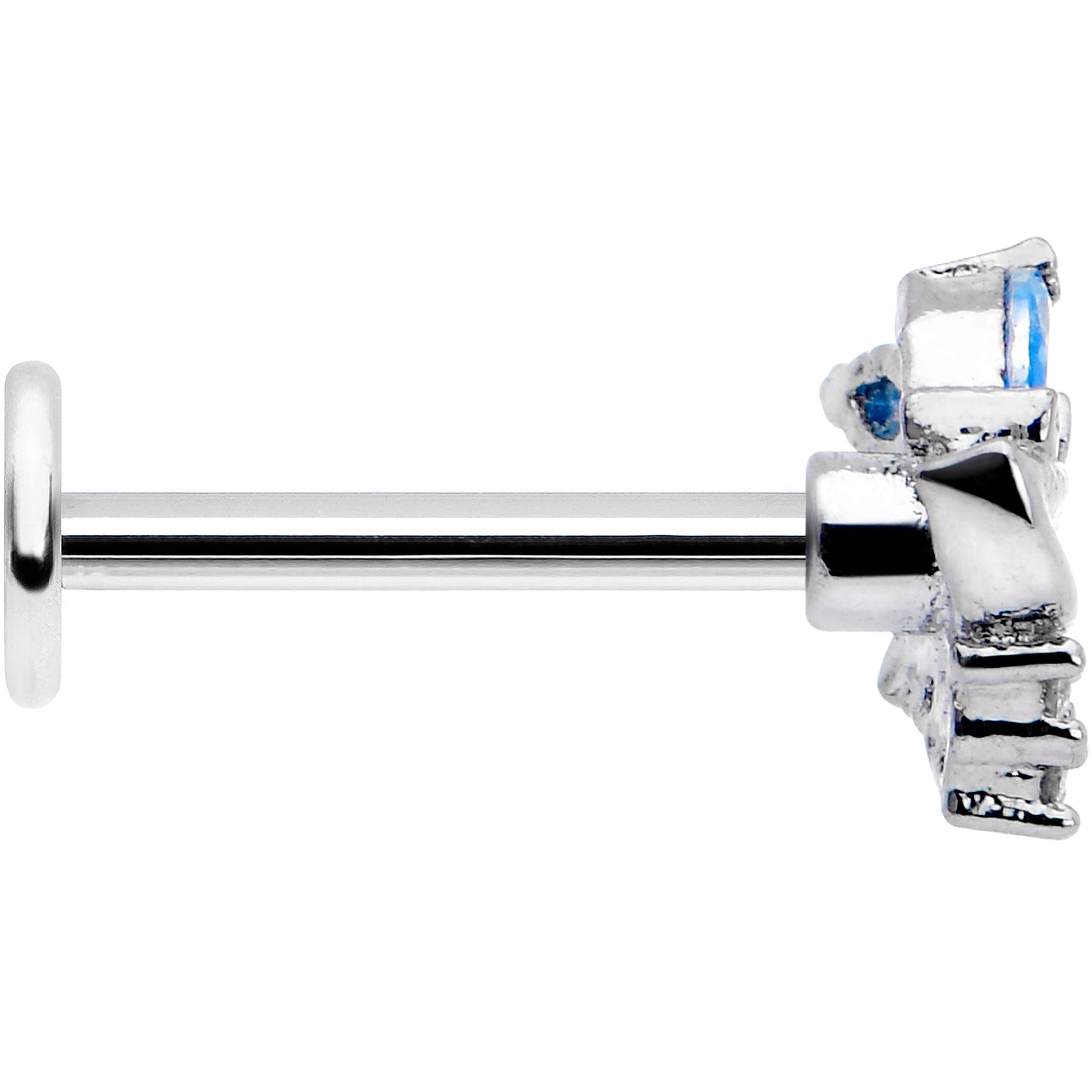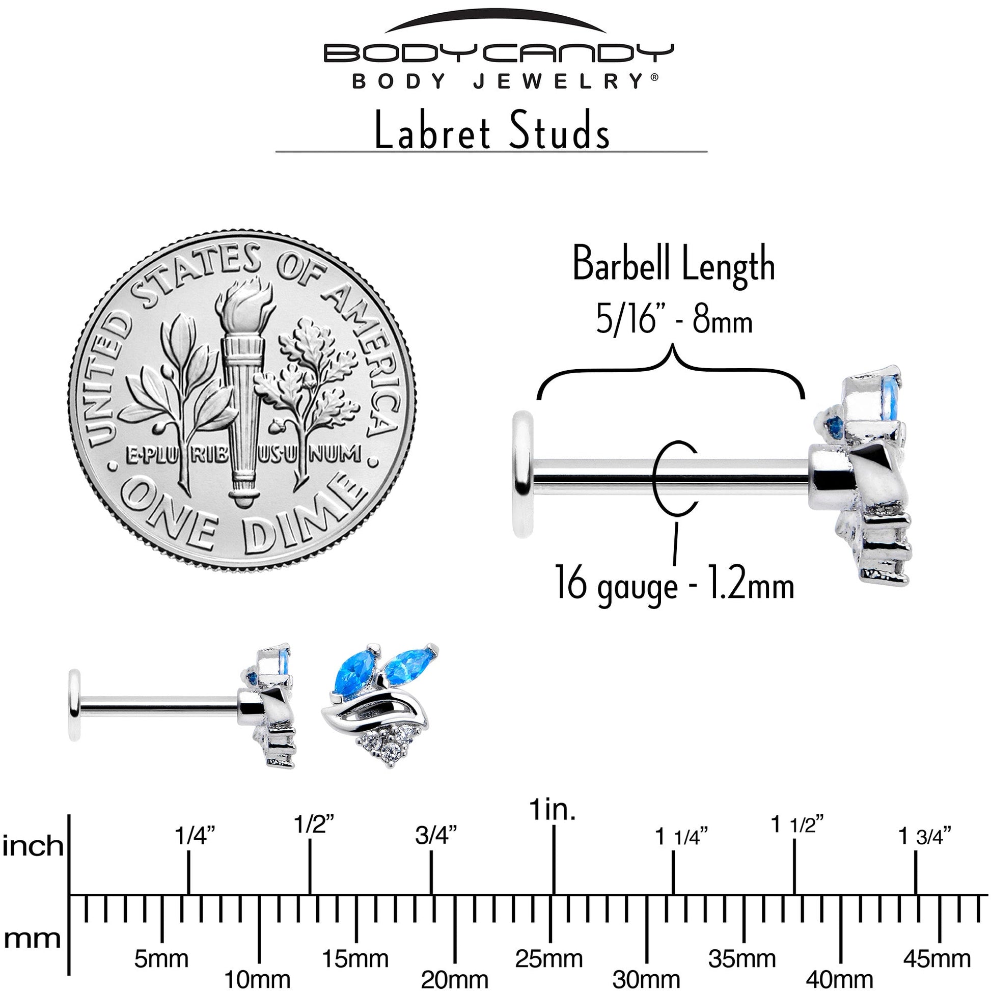 You're sure to be a fan of this 16 gauge lip ring. It's made with an 8mm durable 316L surgical grade stainless steel straight post with a flat disc end. It features a pair of blue cubic zirconia gems fanned out and set above a swirl embellishment. At the base are clear cubic zirconia gems for an added touch of style. You can even rock it in multiple piercings including lip, monroe, tragus, helix, and some conch piercings. This cartilage piercing jewelry has so much glamour it'll make your head swirl.