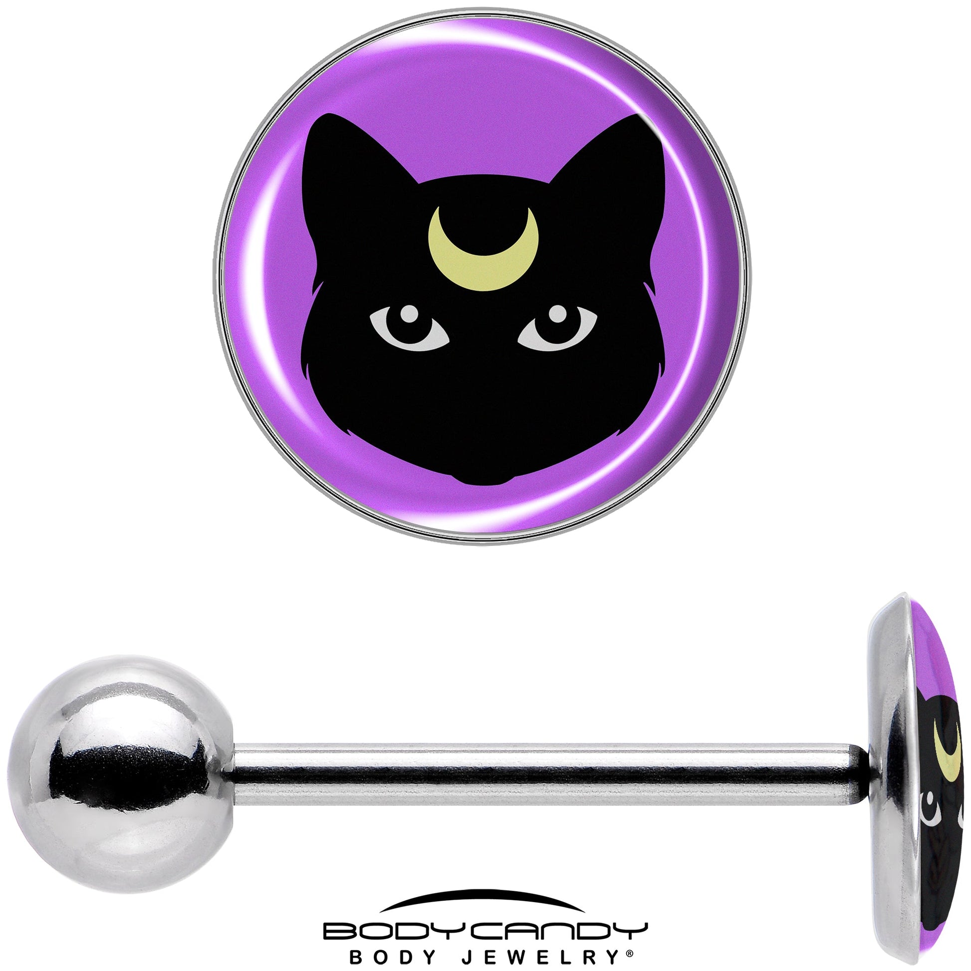 The cat on this 14 gauge tongue ring appears to have been blessed with mystic wisdom. It's made with a 5/8 inch 316L surgical grade stainless steel straight barbell with a 6mm bottom ball end. The top end features a purple disc charm with a black cat's face on it. The cat has simply detailed eyes and a crescent moon on its forehead. Let this cryptic kitty cat cast a spell of style on your look with this delightfully mystical tongue piercing jewelry.