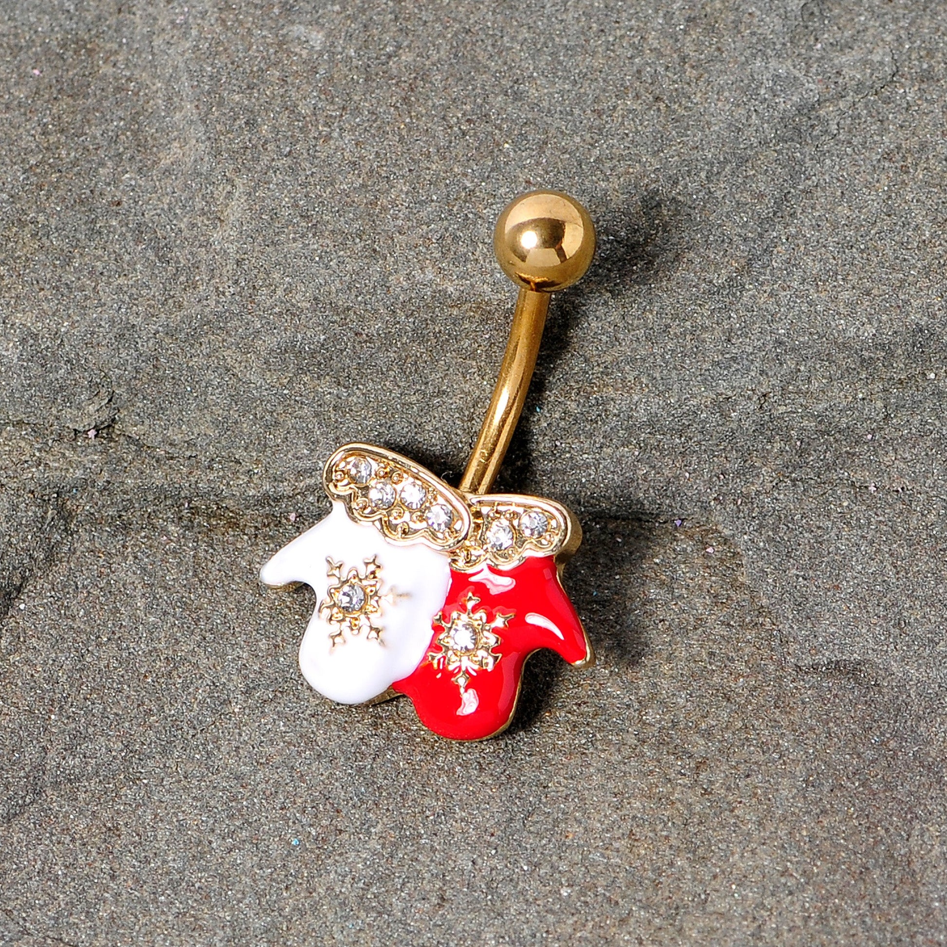 If you can't wait for the first snow day this holiday season then this 14 gauge Christmas belly button ring is right for you! made with a 10mm gold tone plated over 316L surgical grade stainless steel curved barbell, this navel ring features a red and white winter mittens charm complete with clear gem star details and clear gem liners along the top of the charm that makes the winter gloves look warm and fashionable too!