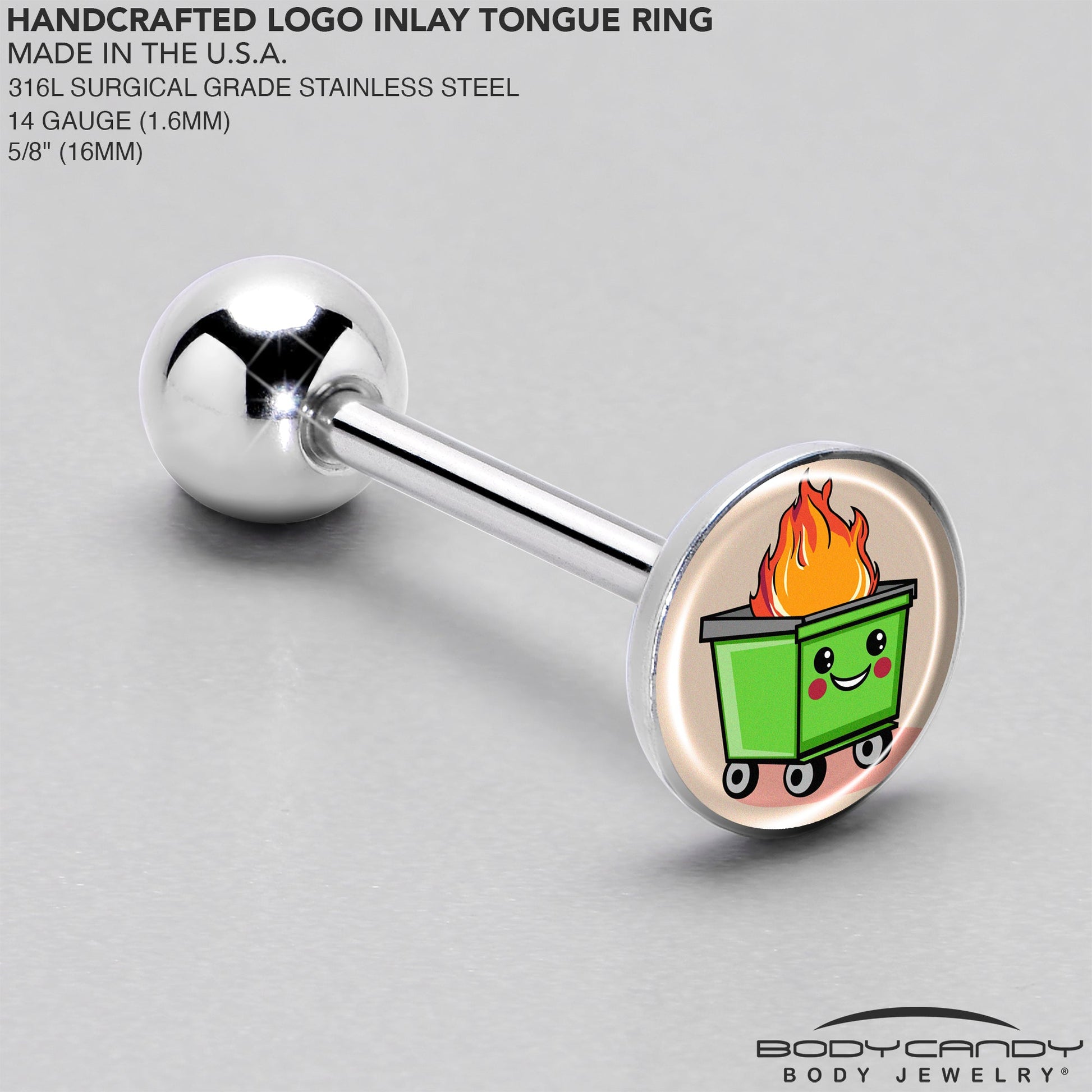 If things aren't going well, add some levity to your look with this 14 gauge stainless steel tongue jewelry. It's made with a 5/8 inch 316L surgical grade stainless steel straight barbell with a 6mm bottom ball end. The top end features a grey disc logo charm that shows a smiling green dumpster with the contents on fire. If it's all going wrong and you're okay with that or you just need some cheering up, this happy dumpster fire is perfect for the job with this stainless steel tongue piercing jewelry. Unique artist-drawn logo inlay design surgical steel tongue ring.