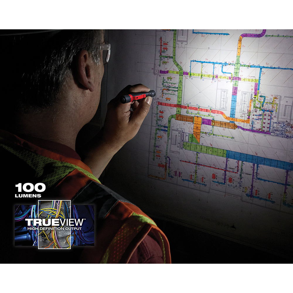 Brighter, clearer, easier inspections. The Milwaukee® penlight delivers 100 lm of TRUEVIEW™ high definition output. Illuminate more area with brighter, natural light for the truest colors and details. A protective rubber bite zone lets users safely direct light while performing two handed tasks. Waterproof and dust proof, this penlight is sealed to withstand the toughest jobsite conditions. The penlight’s 6000 series aircraft aluminum body and lens are impact and corrosion resistant. Use the penlight’s metal clip to attach to any chest or pant pocket for quick, everyday use. The Milwaukee® penlight is covered by a Limited Lifetime Warranty.