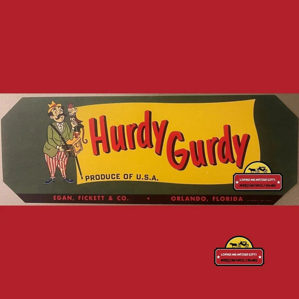 Don't miss this opportunity to own a piece of antique vintage history! This hurdy gurdy crate label isn't just a decoration – it's a time machine, a conversation starter, and a work of art all rolled into one. Bring the charm and nostalgia of 1940s Orlando into your space today!