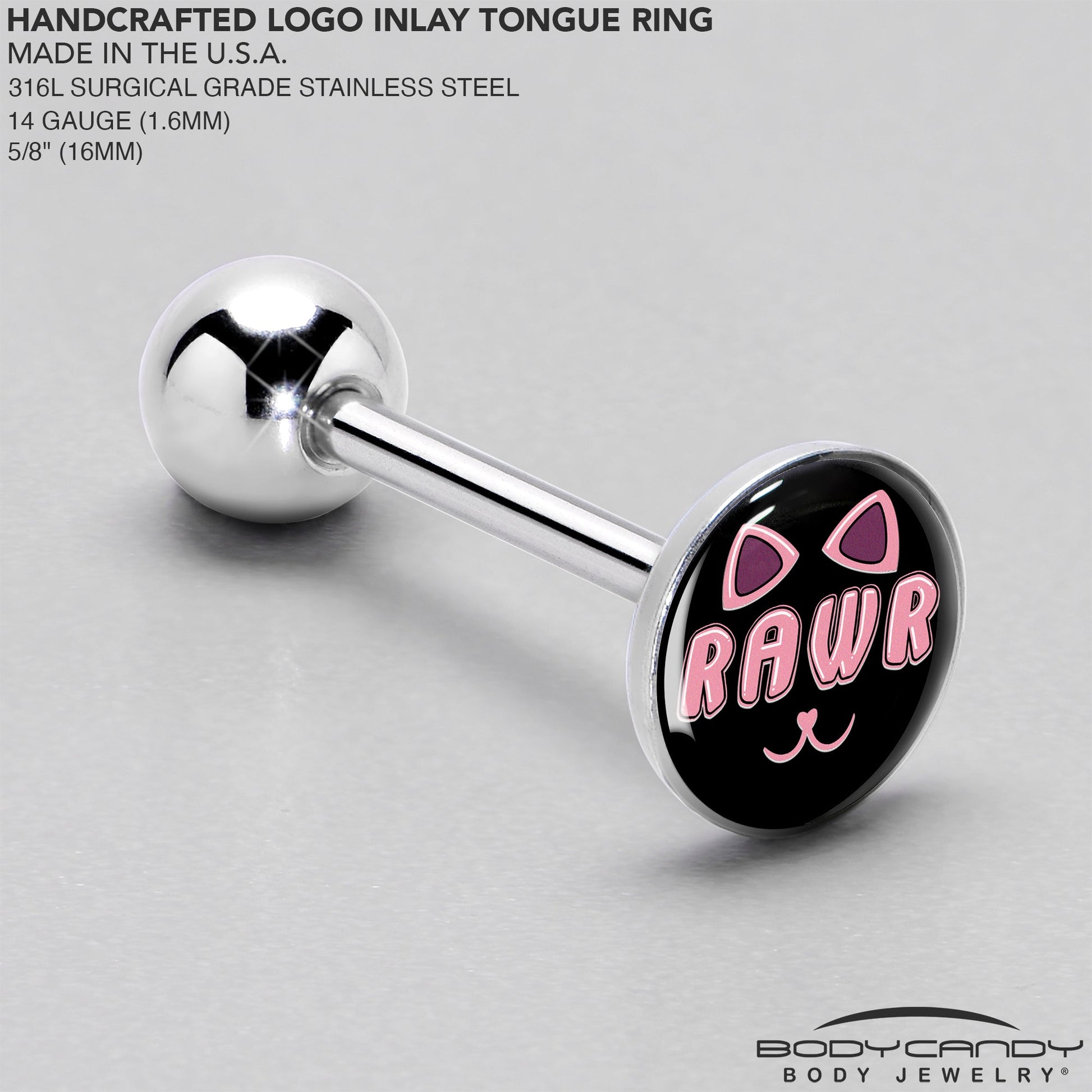 A happy purr is nice, but a mighty rawr rocks when you're wearing this 14 gauge tongue ring. It's made with a 5/8 inch 316L surgical grade stainless steel straight barbell with a 6mm bottom ball end. The top end features a black background and has a cat's ears, nose, and grinning mouth, with the word "RAWR" across the eyes. Let your style roar like a mighty feline with the sweet kitty on this stylish tongue piercing jewelry.