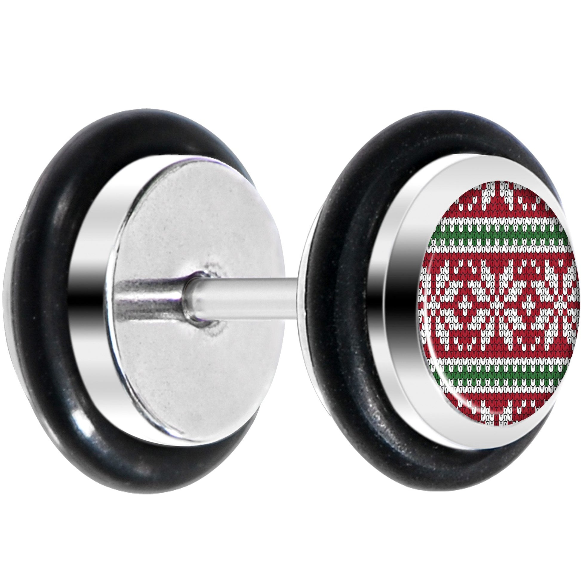 Get decked out from head to toe without the pain of stretching your ears when you wear this pair of festive fake holiday plugs! Made with durable 316L surgical grade stainless steel posts, these faux plugs fit a 16 gauge piercing but look like a size 0 and feature red with green and white snowflake Christmas sweater logo inlays. This pair of Christmas fake plug earrings is sold as a set of two for you, and makes a perfect seasonal gift too.