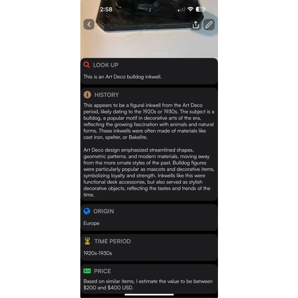 Prepare to be dazzled by this extraordinary piece of Art Deco history! The AI Scan reveals a truly captivating item that's not just a feast for the eyes, but a tangible connection to a bygone era. Weighing in at an impressive 1 3/4 pounds, this isn't your average desk accessory - it's a substantial piece of the past you can hold in your hands. Crafted from what feels like metal or another weighty material, this Art Deco bulldog (inkwell?) commands attention with its 6" x 4" base and stands proud at 5 1/2" tall. It's not just an inkwell; it's a time machine that'll transport you straight back to the Roaring Twenties! I spoke with a gemologist online, and she believed that after examining the listing, it was made of Kite, a truly unique substance.