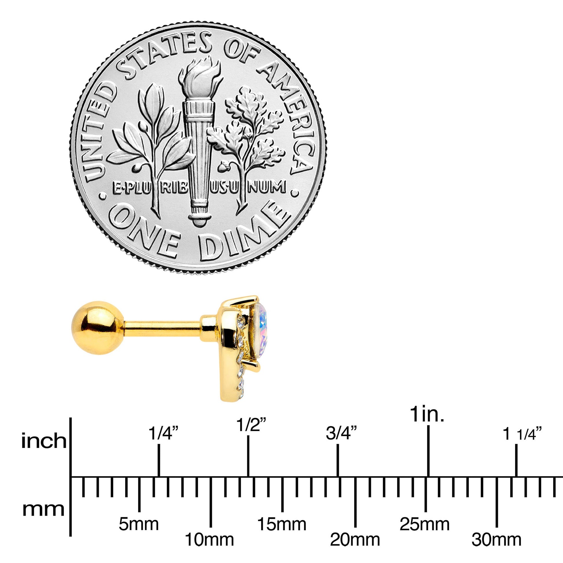Look luxe and love it without breaking the bank with this 16 gauge tragus stud! It's made with a 6mm gold tone PVD over 316L surgical grade stainless steel straight barbell with a 4mm ball end. It features a heart charm, with one heart composed of a single aurora gem. It's set within a second heart, paved with clear gems. You can even rock these hearts in multiple piercings including tragus, helix, and some conch piercings. You're going to fall in love with the opulent look of this heart-themed cartilage stud!Specifications