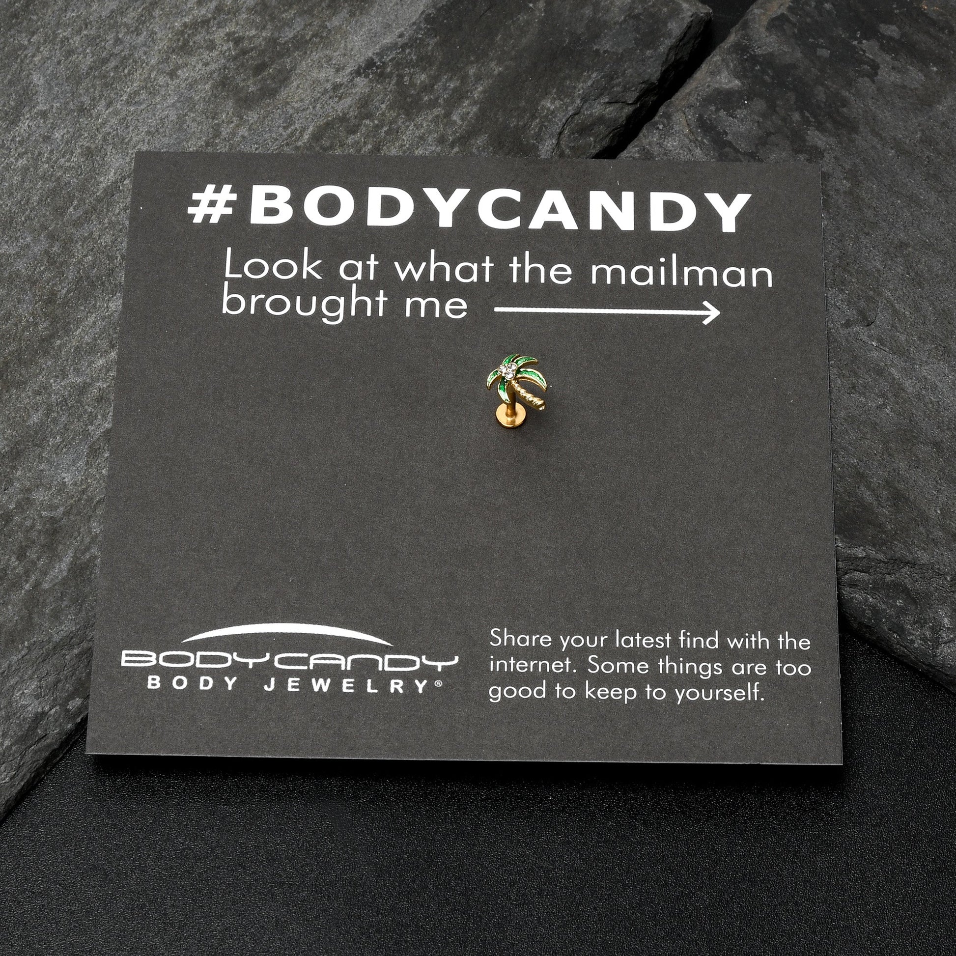 Take a trip to the tropics in total style like on this 16 gauge lip ring. It is made with a 6mm gold tone electroplate over 316L surgical grade stainless steel straight post with a flat disc end. It features an elegant palm tree charm. The trunk features textured detailing while the top of the tree is set with clear gems. The leaves feature green inlay for elegant color contrast. You can even put this palm tree in multiple piercings including tragus, helix, and some conch piercings. Grab your beach towel and sunscreen, it is time to rock a tropical look with this perfect palm tree cartilage piercing jewelry.Specifications