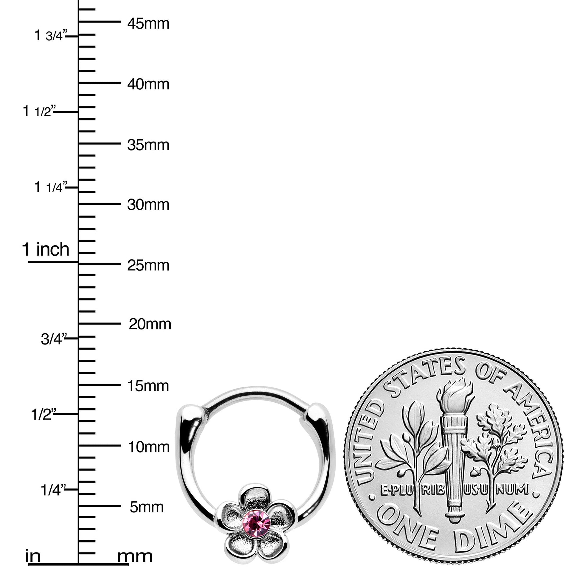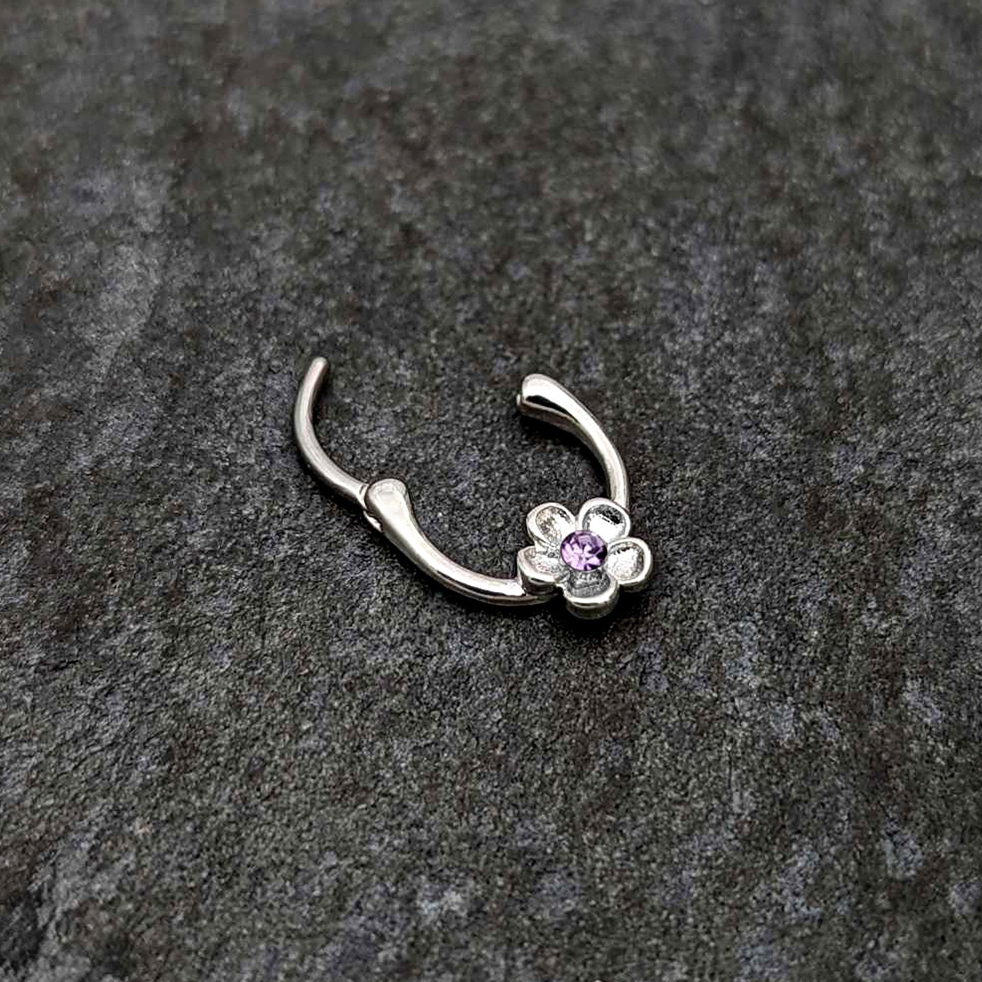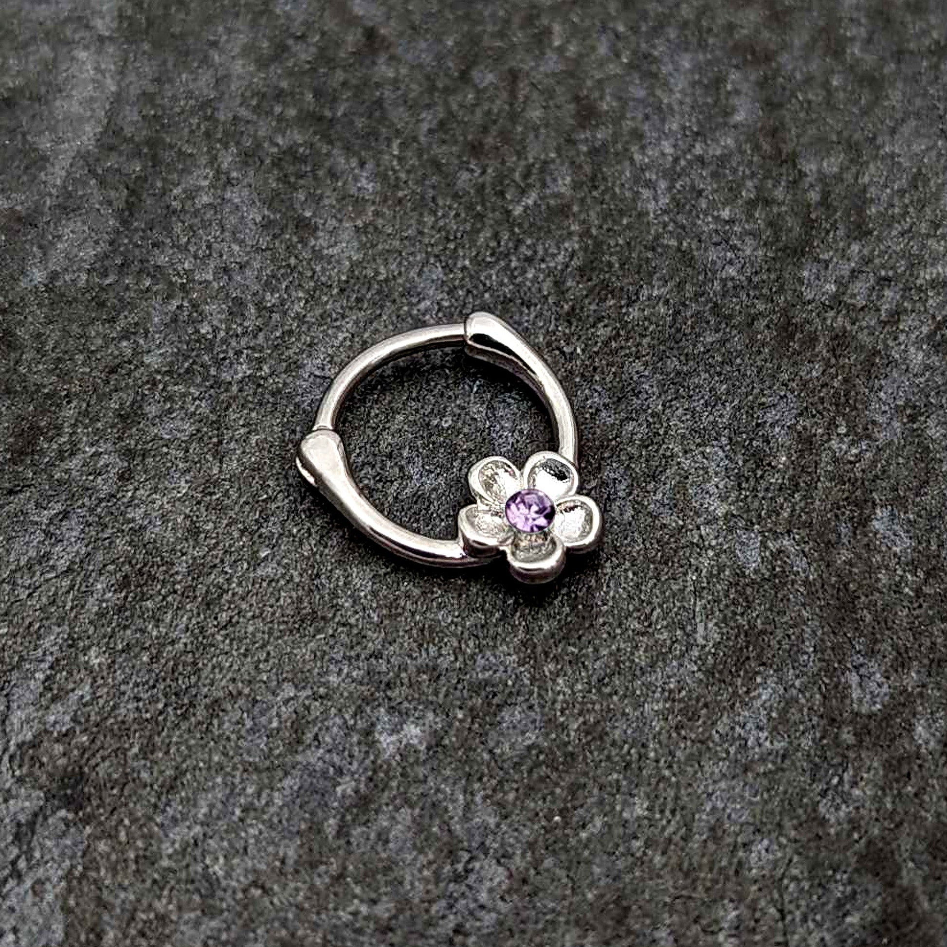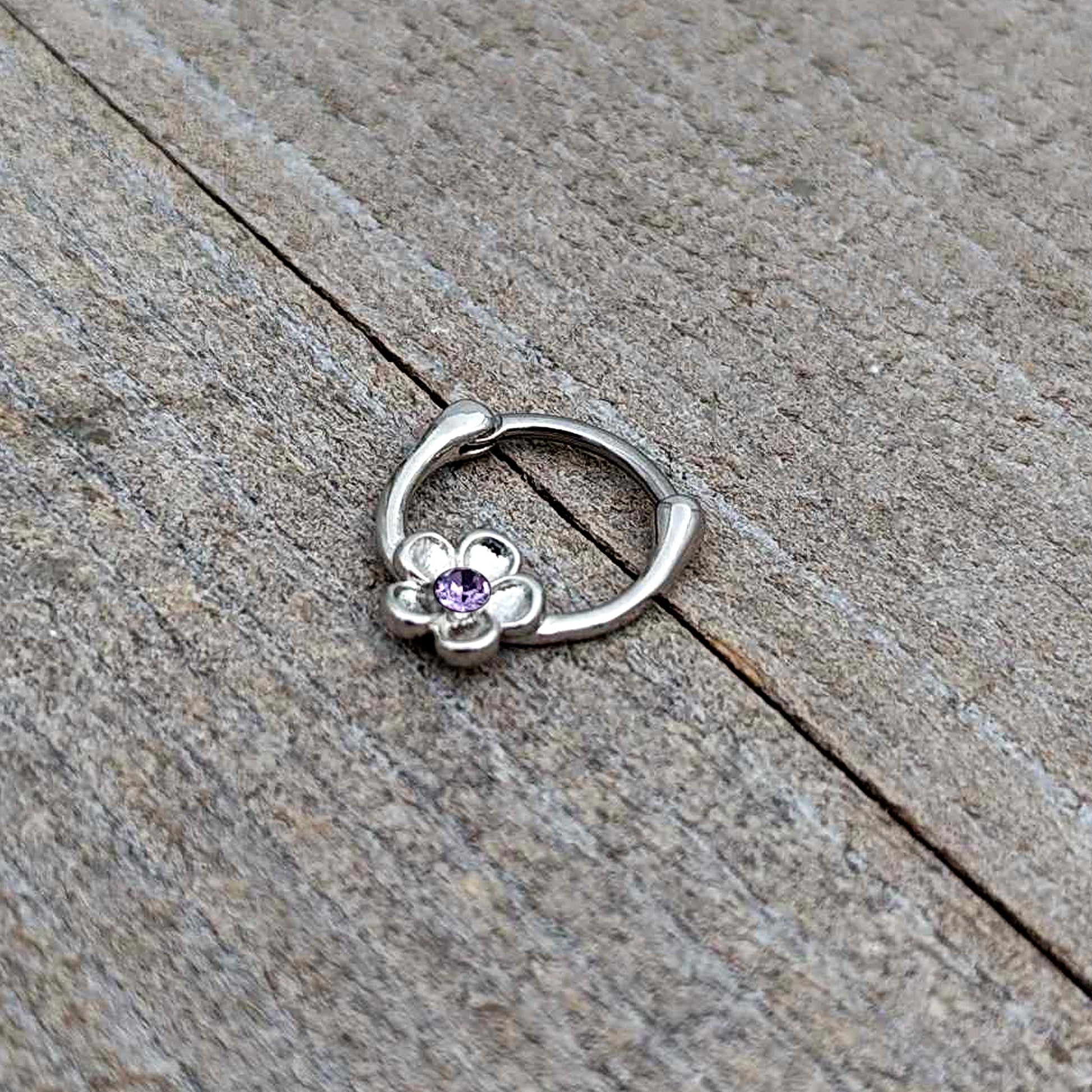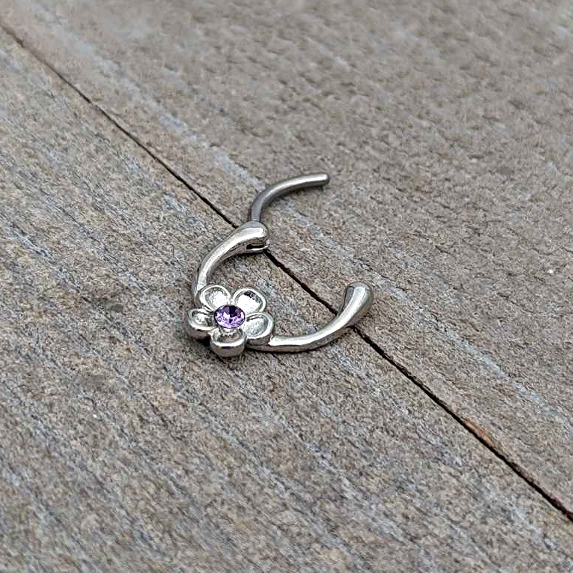 What could feel more like Spring than this 16 gauge septum ring? It's made with an 8mm durable 316L surgical grade stainless steel hinged curved barbell. It features a simply styled flower charm, set with a purple gem embellishment at the center. The hinged, clicker design makes insertion and removal a snap and you can even rock this ring in multiple piercings including tragus, helix, and some daith piercings. Let your cartilage piercings sport some sweet springtime style with this charming and stylish cartilage piercing ring!