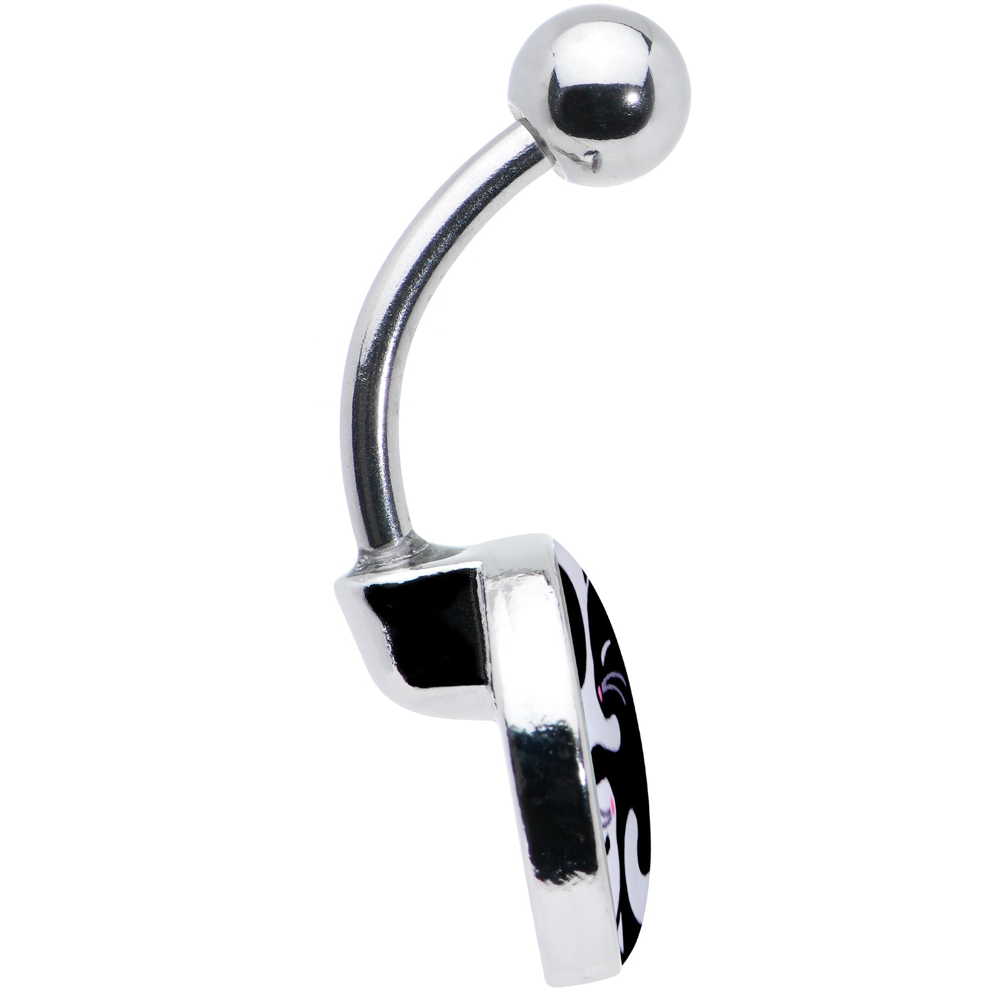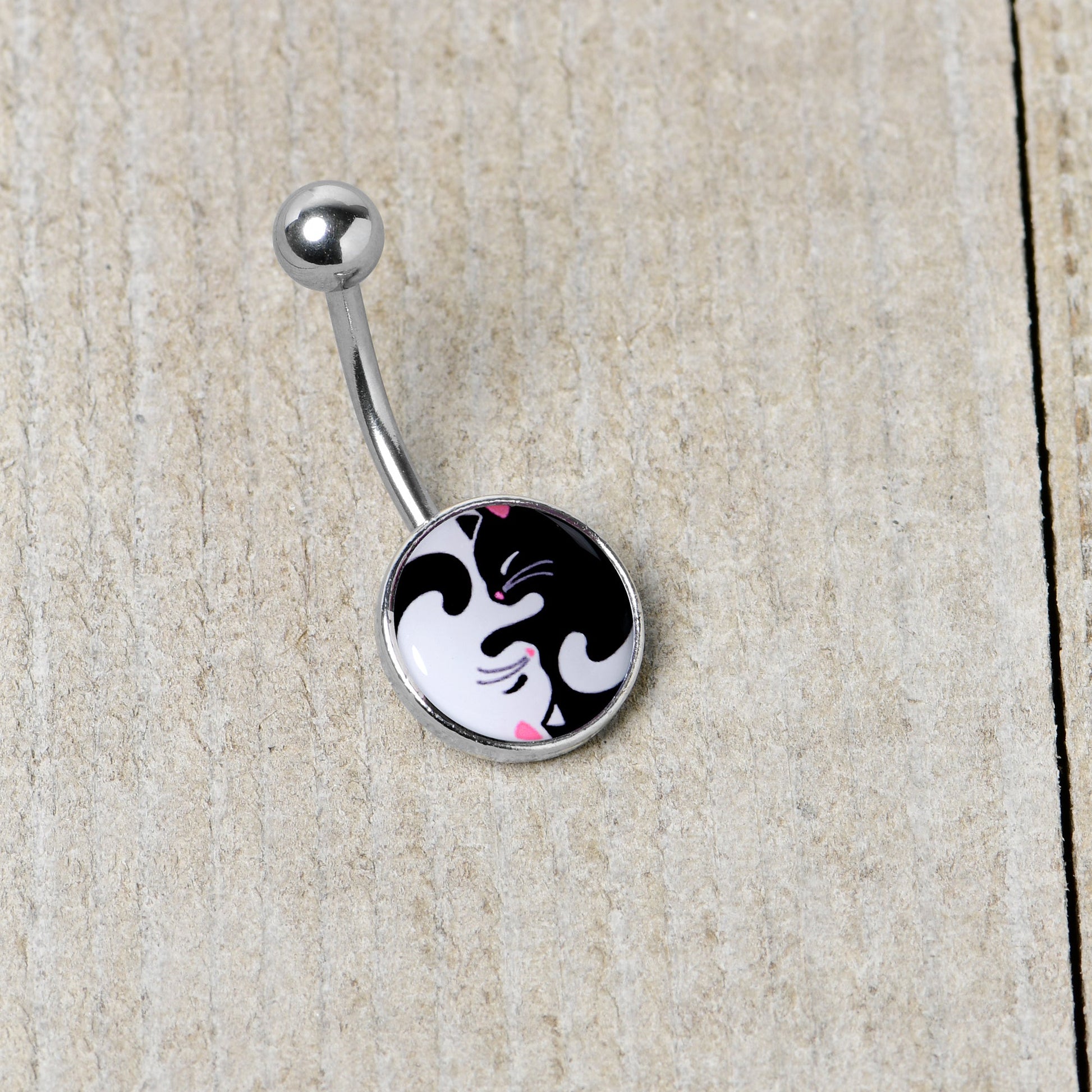 Embrace the darkness and the light with the sweet kitty cats on this 14 gauge navel ring! It's made with a 7/16" durable 316L surgical grade stainless steel curved barbell with a 5mm top ball end. The bottom end features a yin yang charm. The yin yang symbol is composed of a pair of contented cats, one in black and one in white. They both feature pink detailing and sweetly sleepy expressions. You'll be ready to purr when you're rocking this fabulous feline belly piercing ring.