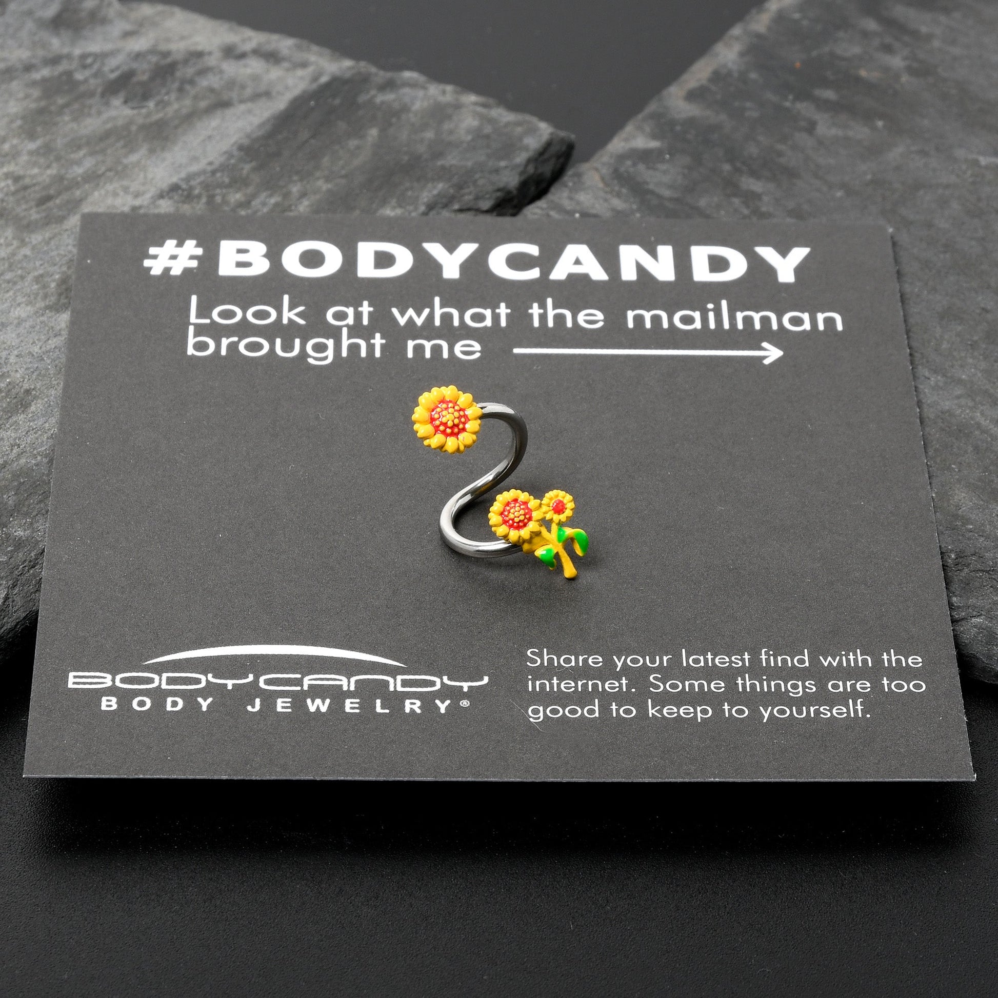 The sun is out, and it has brought some friends on this 14 gauge navel ring. It is made with a 3/8 inch 316L surgical grade stainless steel spiral curved barbell. The top end features a yellow sunflower charm with textured detailing at its center. The bottom end features a pair of yellow sunflowers embellished with green leaves. You can even flaunt these flowers in multiple piercings including lip, some eyebrow, and some helix piercings. Make every day a sunny day with this striking sunflower belly piercing ring.Specifications
