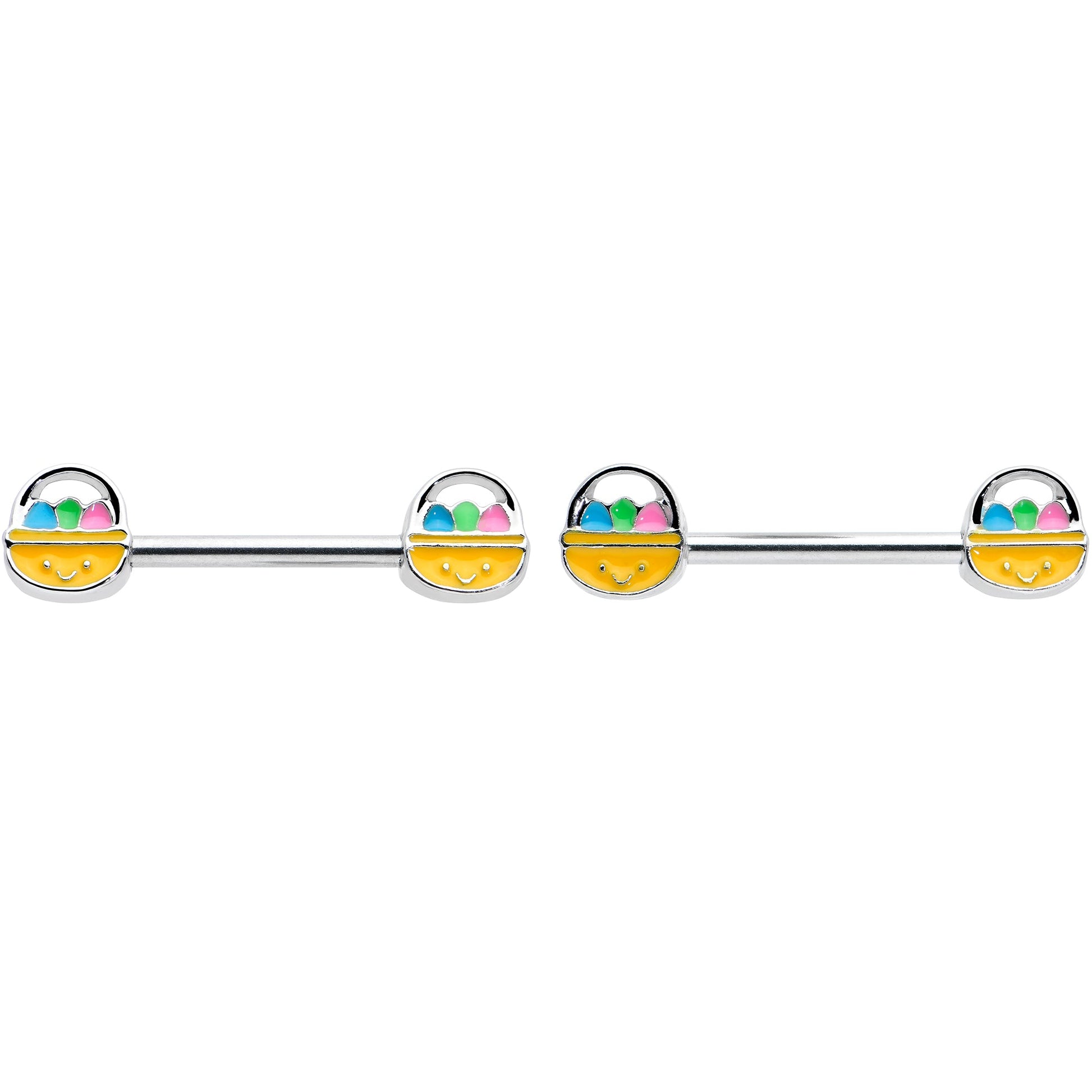 Put all your eggs in one basket with style when you're rocking this 14 gauge nipple jewelry! It's made with 14mm durable 316L surgical grade stainless steel straight barbells. Each of the ends features a yellow Easter basket charm, with a cheery smiling face. The baskets each contain Easter eggs in pink, green, and blue, for an added touch of festive color. You'll be hopping down the bunny trail in kawaii style with these Easter themed nipple piercing rings! Sold as a set of two.