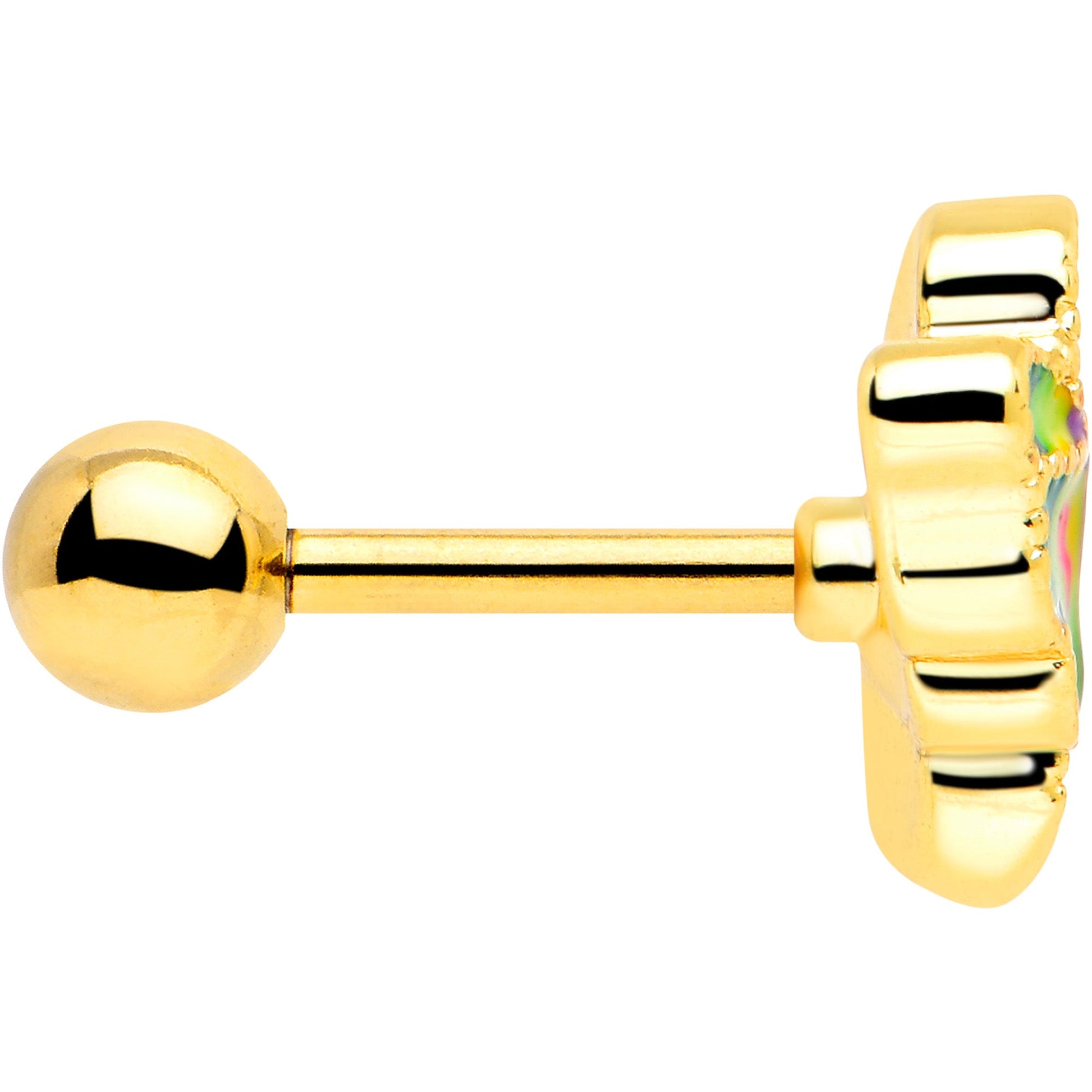 Have a look that's live and in color with this 16 gauge tragus stud. It's made with a 6mm gold tone PVD over 316L surgical grade stainless steel straight barbell with a 4mm ball end. It features a butterfly charm, with intense blue, yellow, and green colors and embellished with a dark blue gem eye for an added touch of style that you can rock in multiple piercings including tragus, helix, and some conch piercings. Rock some rich colors that can't be ignored when you're rocking this colorful butterfly cartilage piercing jewelry.