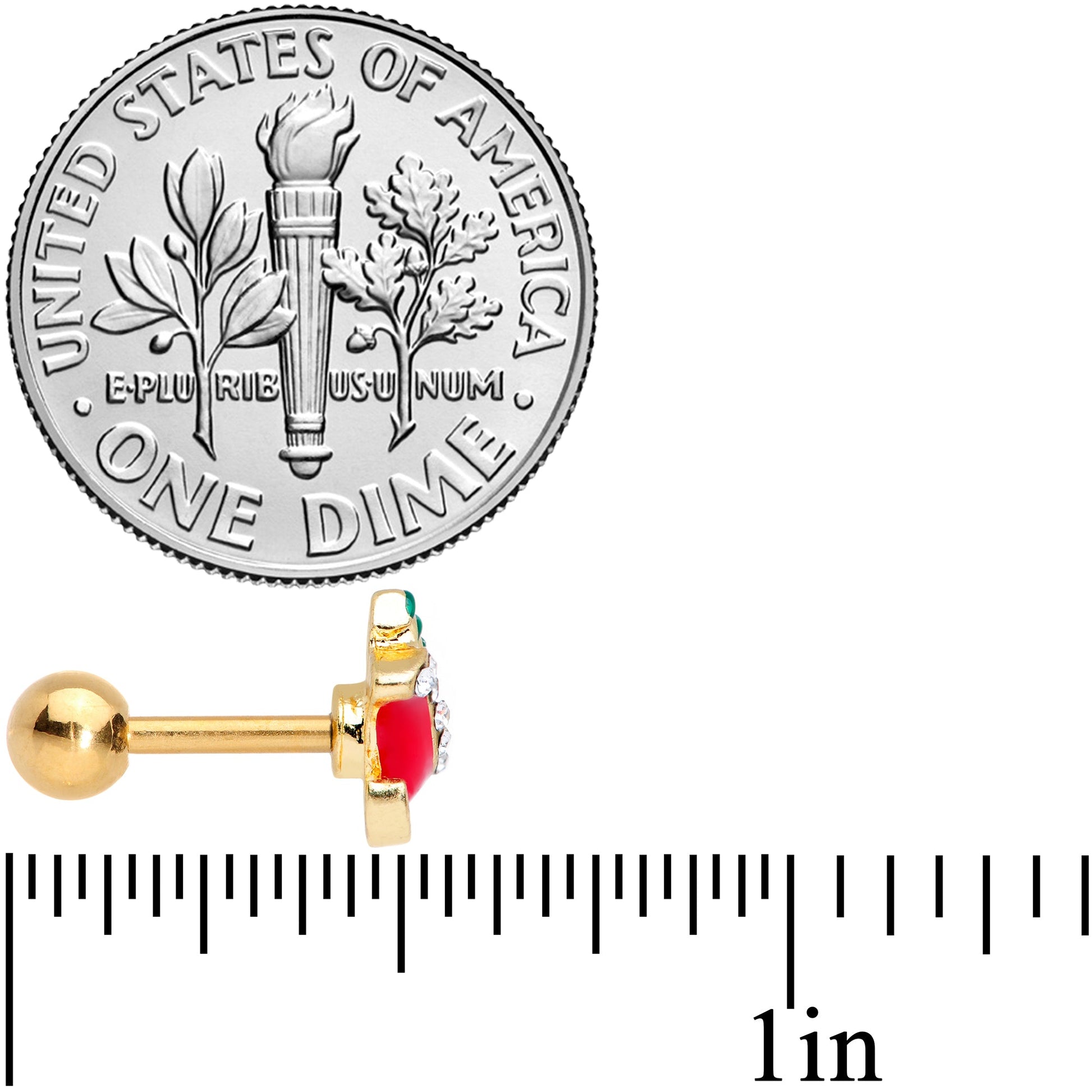 Santa is all packed up and ready to roll on this 16 gauge tragus stud! It's made with a 6mm gold tone PVD over 316L surgical grade stainless steel straight barbell with a 4mm ball end. It features a red Santa's sleigh charm with small clear gems. The sleigh is loaded with a green Christmas tree and other goodies waiting to be delivered to everyone who made it onto the "nice" list. And this sleigh can travel between your piercings and works well in tragus, helix and some conch piercings. Now that's a holiday look that's ho-ho-hot!