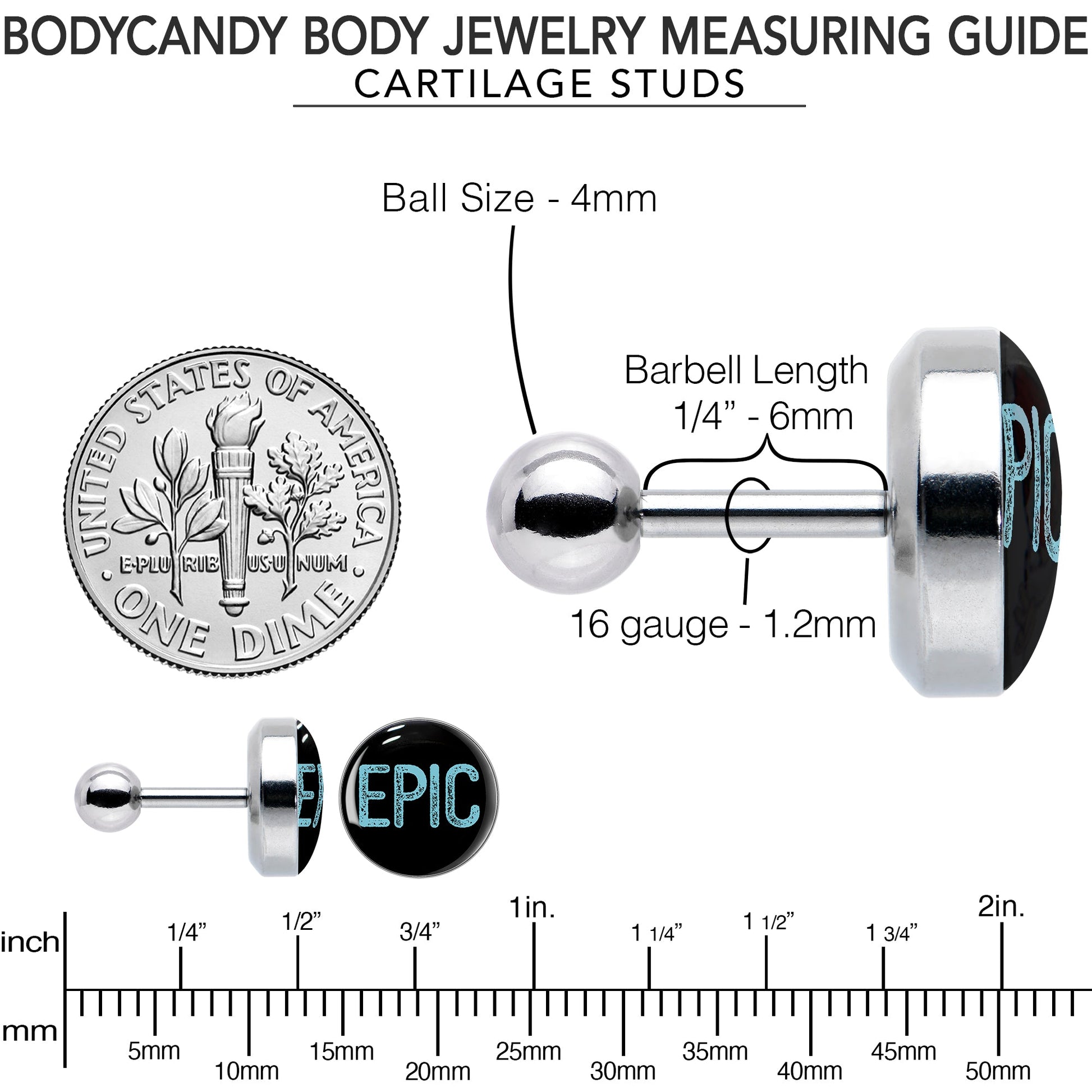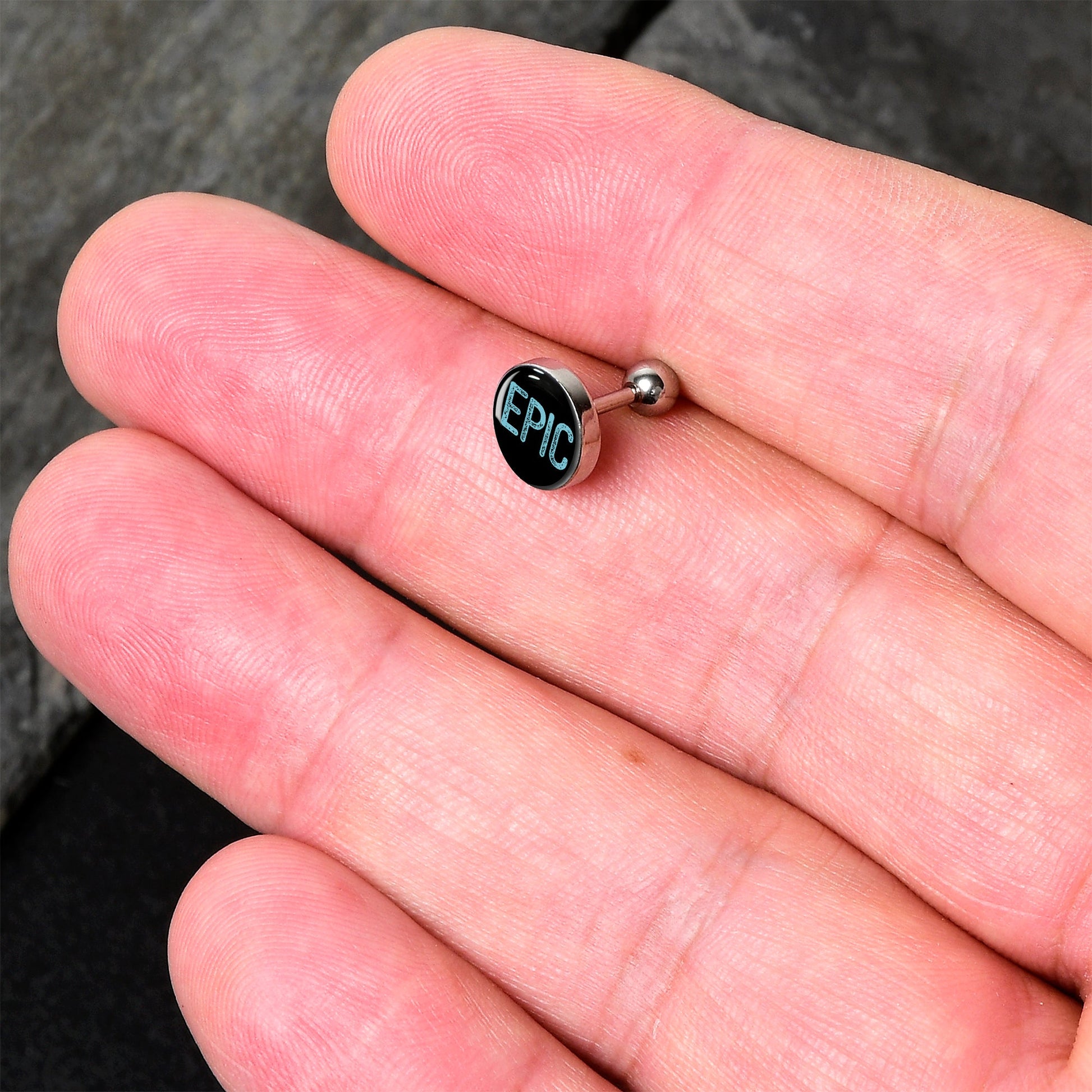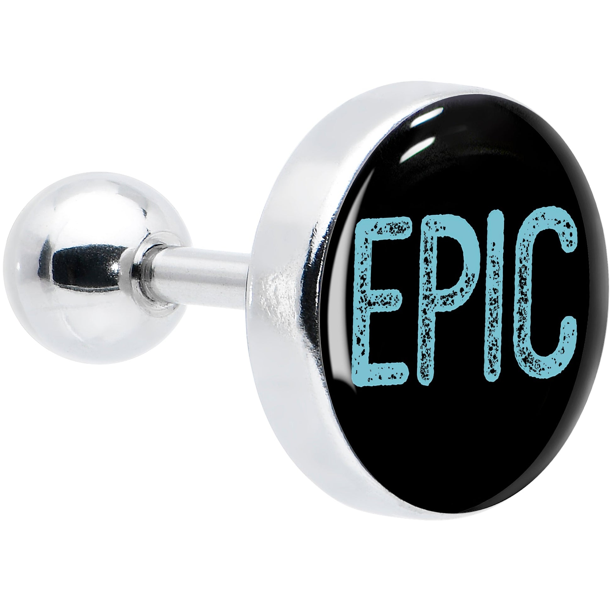 Some things are better than great, they are truly epic - as seen on this 16 gauge tragus stud. It is made with a 6mm durable 316L surgical grade stainless steel straight barbell with a 4mm ball end. The front end features a black, disc shaped charm. It features the word epic, in blue, all capital letters and you can rock it in multiple piercings including tragus, helix, and some conch piercings. If you are brimming over with love about something truly amazing, spread the word with this thoroughly epic cartilage piercing ring.