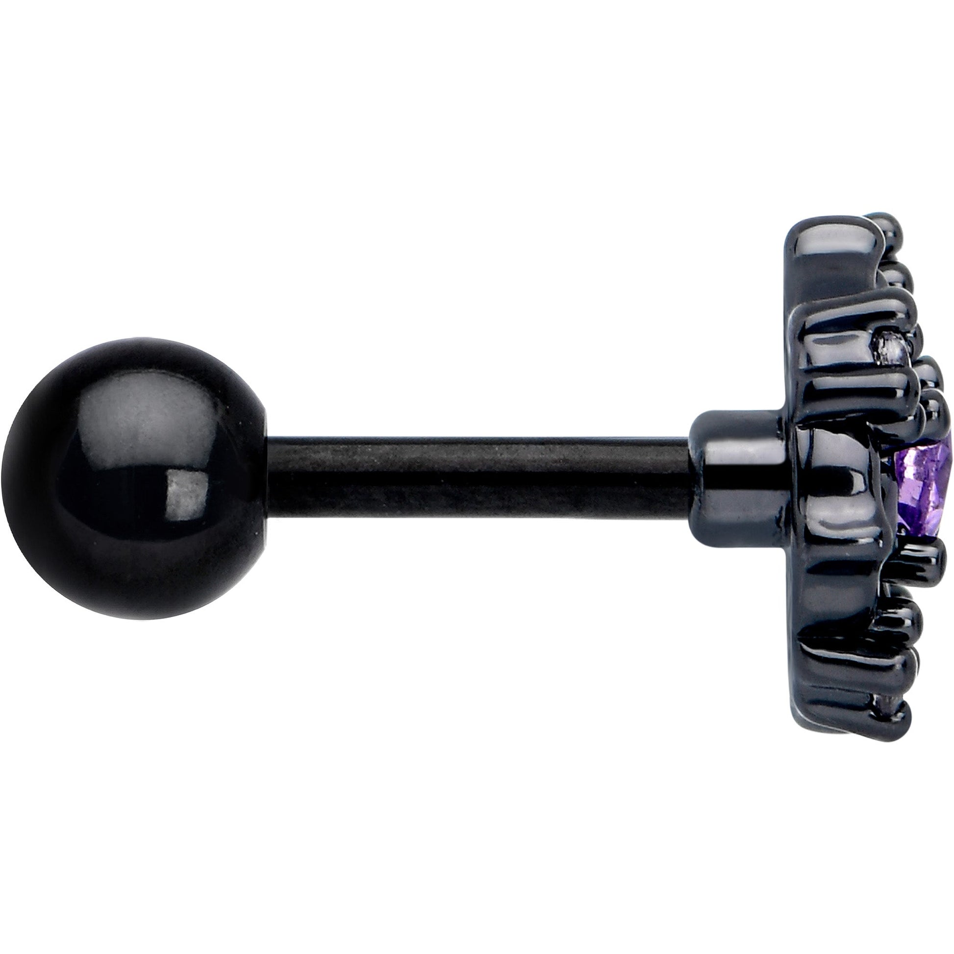 16 Gauge 1/4 Purple CZ Gem Black Flower Ring Cartilage Tragus Earring