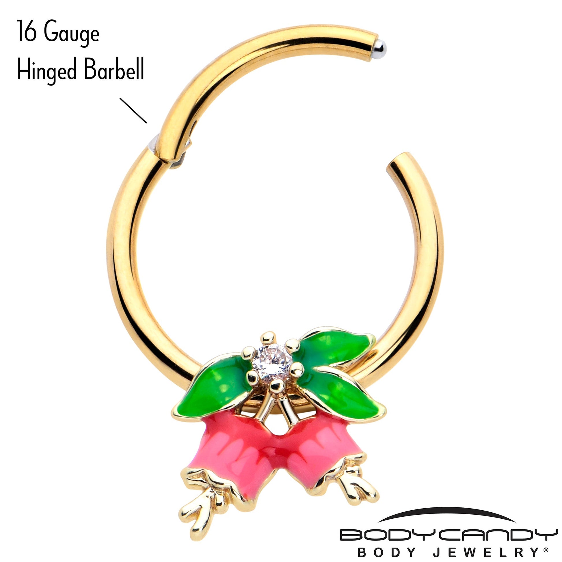 The flowers on this 16 gauge septum ring are sure to ring your bell. It's made with a 10mm gold tone PVD over 316L surgical grade stainless steel hinged circular ring. It features a red and pink flowers charm with matching detailing. At the base of the flowers is a trio of green leaves with a clear cubic zirconia gem at the center. It also features a non-removable, hinged segment that makes insertion and removal a breeze and you can rock it in multiple piercings including tragus, helix, and some daith piercings. You'll be ready to make some noise when you're rocking this fashionable, floral cartilage piercing jewelry.