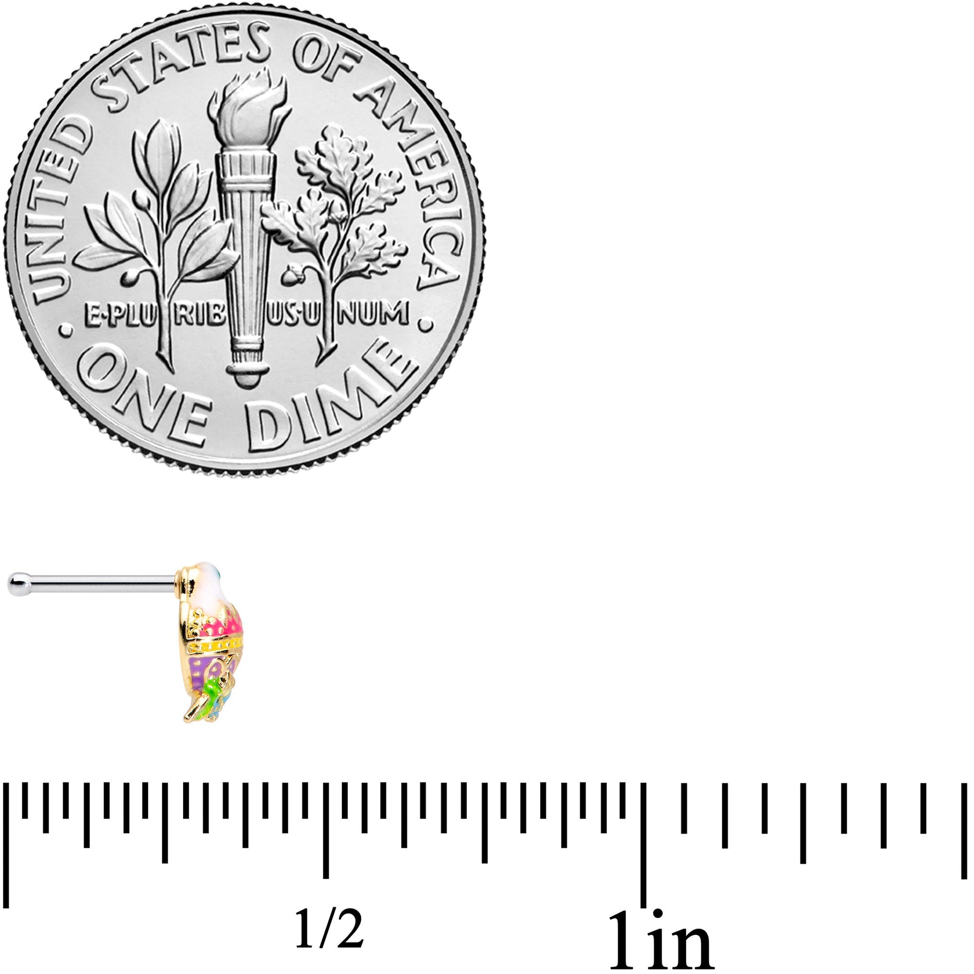The chick on this 20 gauge nostril ring is living like royalty! It's made with a 6mm durbable 316L surgical grade stainless steel straight post. It features an Easter egg charm with a little chick peeking its head out of the top. The egg is lavishly embellished with pink, yellow and purple inlay. At its base are leaves and flowers, further embellishing it for a look that is truly opulent. Let your nose piercing look like royalty this Easter with this elegant Easter egg nostril jewelry!Specifications