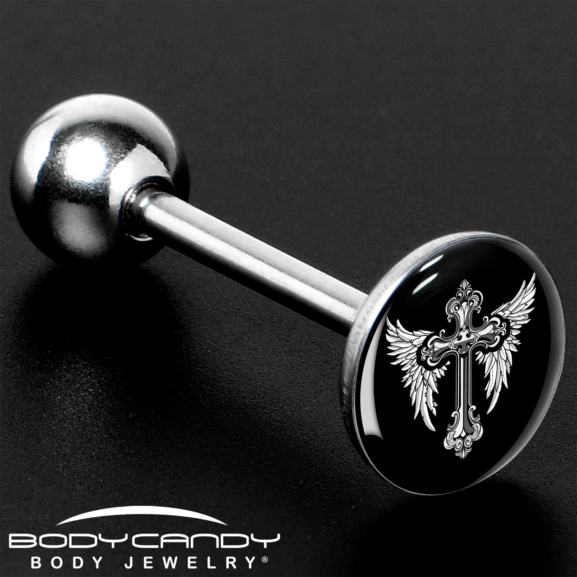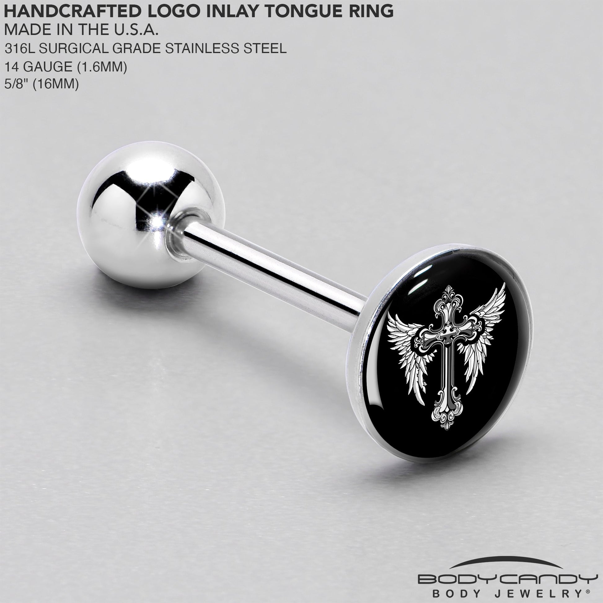 Give your soul some wings with this 14 gauge tongue ring. It's made with a 5/8 inch 316L surgical grade stainless steel straight barbell with a 6mm bottom ball end. The top end features a cross charm, with detailed wings on a black background, for a look that mixes spirituality with style. Give your look a lift while honoring your beliefs with this winged cross tongue piercing jewelry.