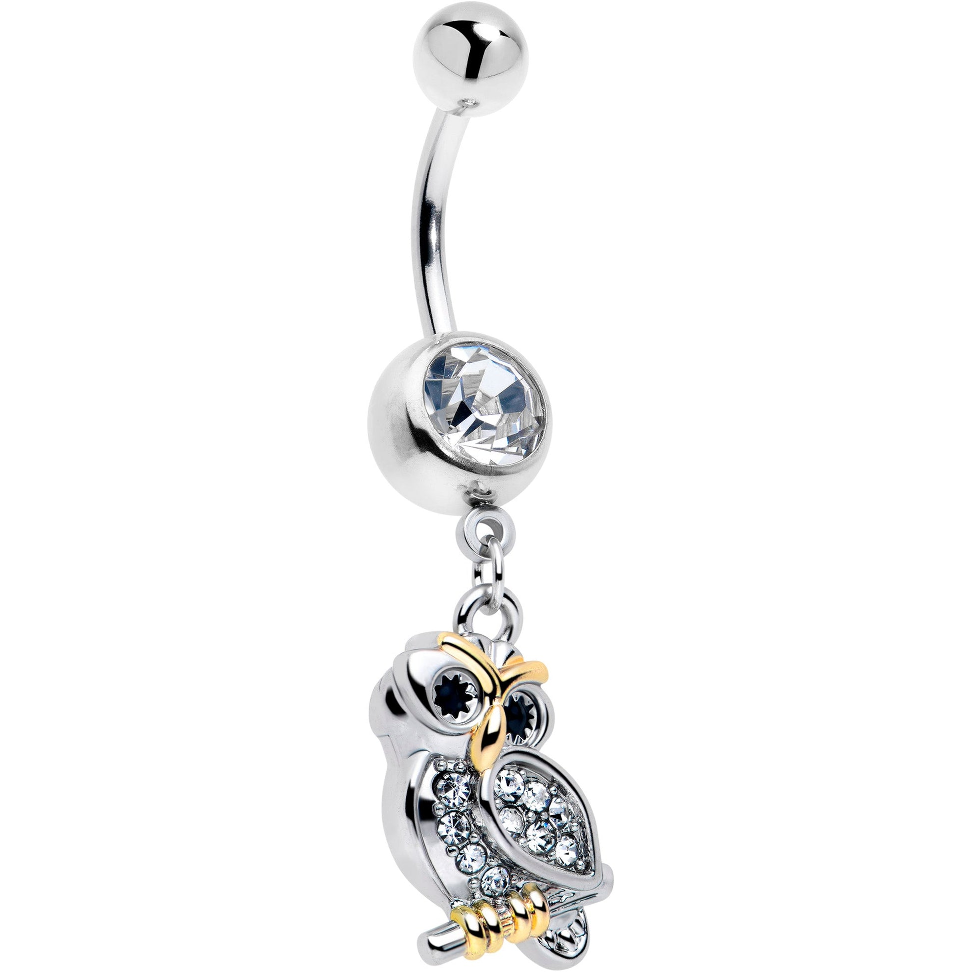 If only all the owls looked as elegant as the one on this 14 gauge navel ring. It's made with a 3/8 inch 316L surgical grade stainless steel curved barbell with a 5mm top ball end. The bottom ball end is 8mm and set with a large, clear gem. Dangling beneath it is an owl charm with clear gems. It also features gold tone embellishment for a truly striking combination of forest and fancy that's sure to attract attention. When you're rocking this elegant evening owl belly piercing jewelry, you're sure to look like avian aristocracy.