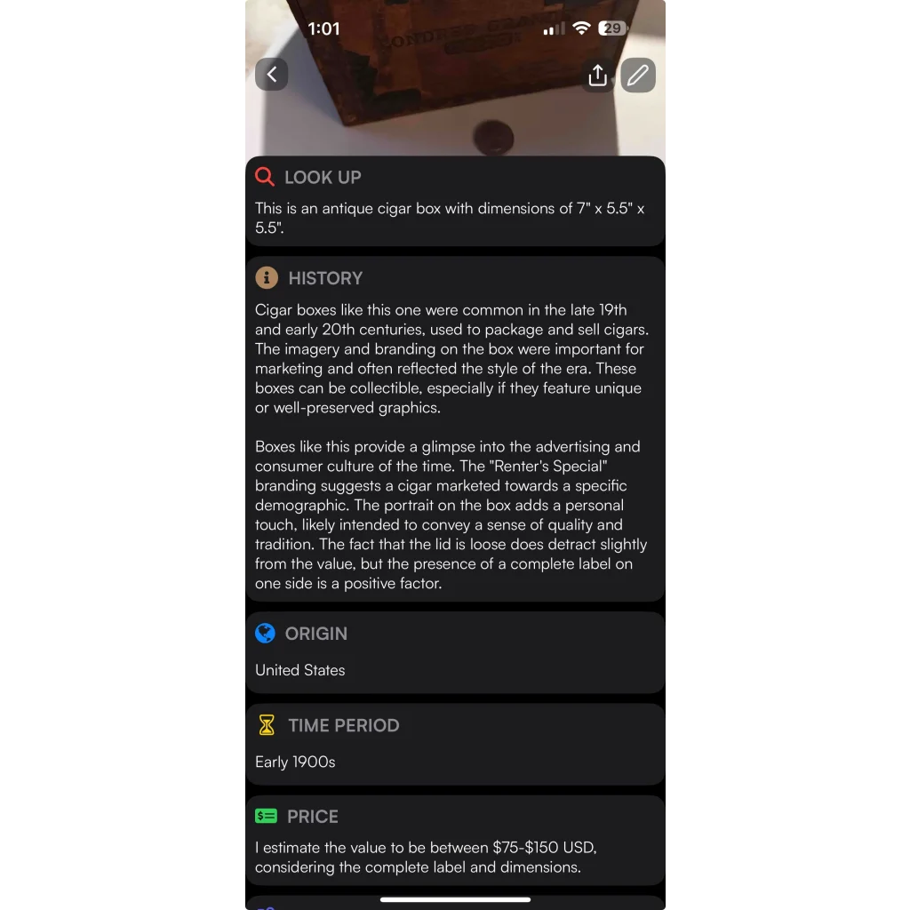 Hold onto your hats, folks! This isn't just any old cigar box – it's a time machine disguised as a treasure chest of Americana! The AI Scan might've given us the basics, but there's so much more to this incredible piece of history that'll make your jaw drop. Picture this: a stunning antique cigar box from the early 1900s, measuring a compact 7" x 5.5" x 5.5", absolutely bursting with character and charm.