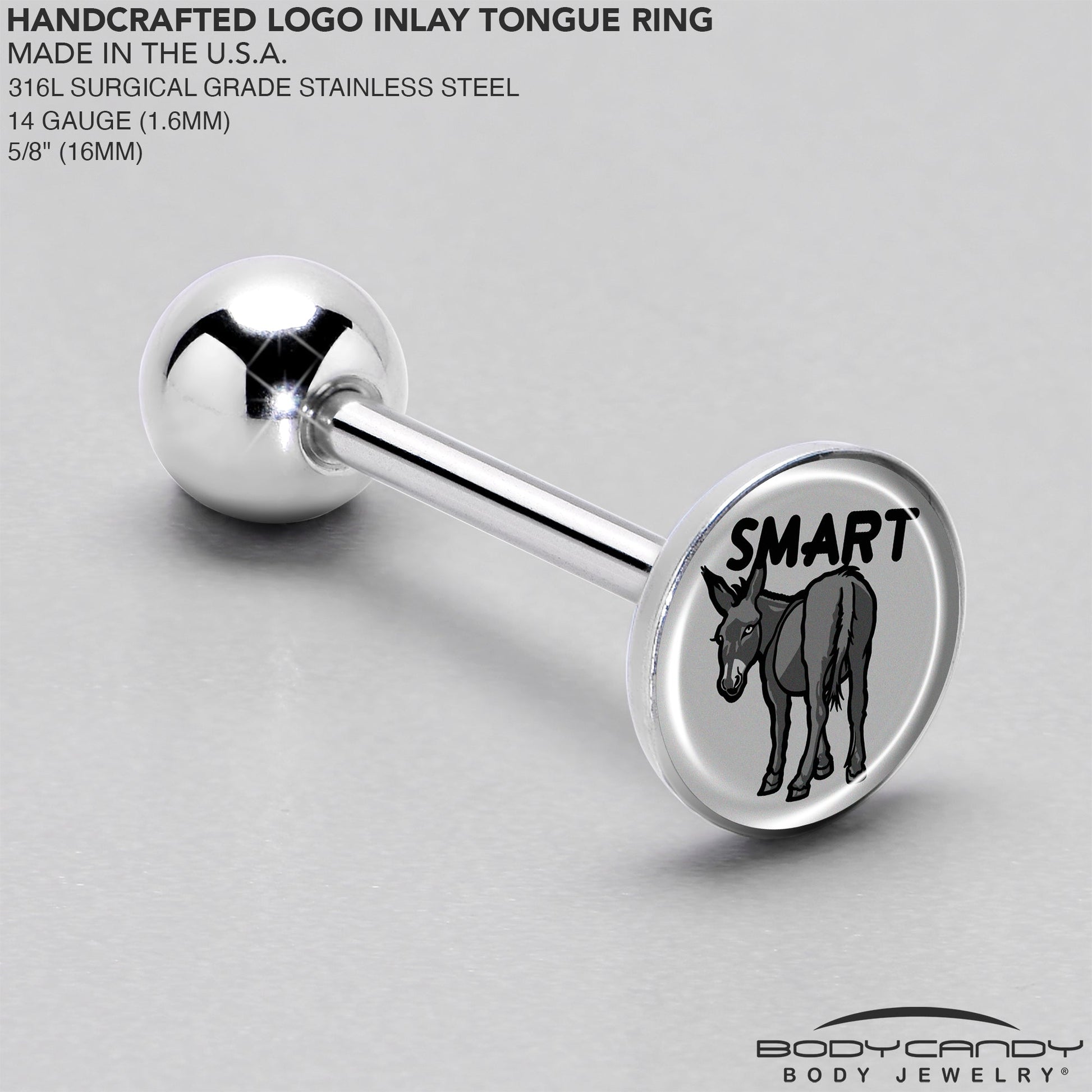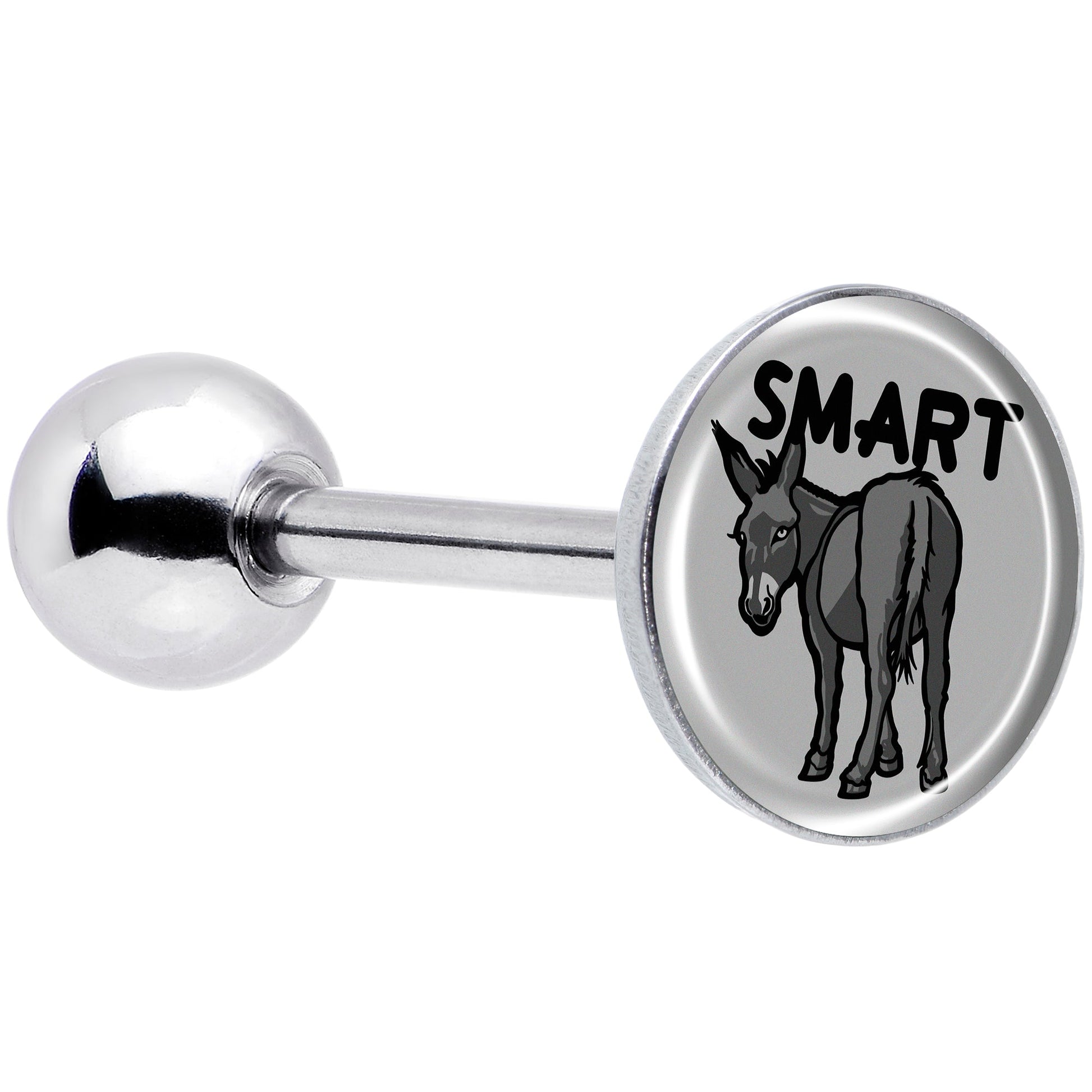 Give your look some sass with the smart ass on this 14 gauge tongue ring. It's made with a 5/8 inch 316L surgical grade stainless steel straight barbell with a 6mm bottom ball end. The top end features a grey disc charm. It features a donkey with a the word "smart" over it, for a clever bit of wordplay that's sure to get some laughs. Get some smartass style with the delightful donkey on this tongue piercing jewelry.